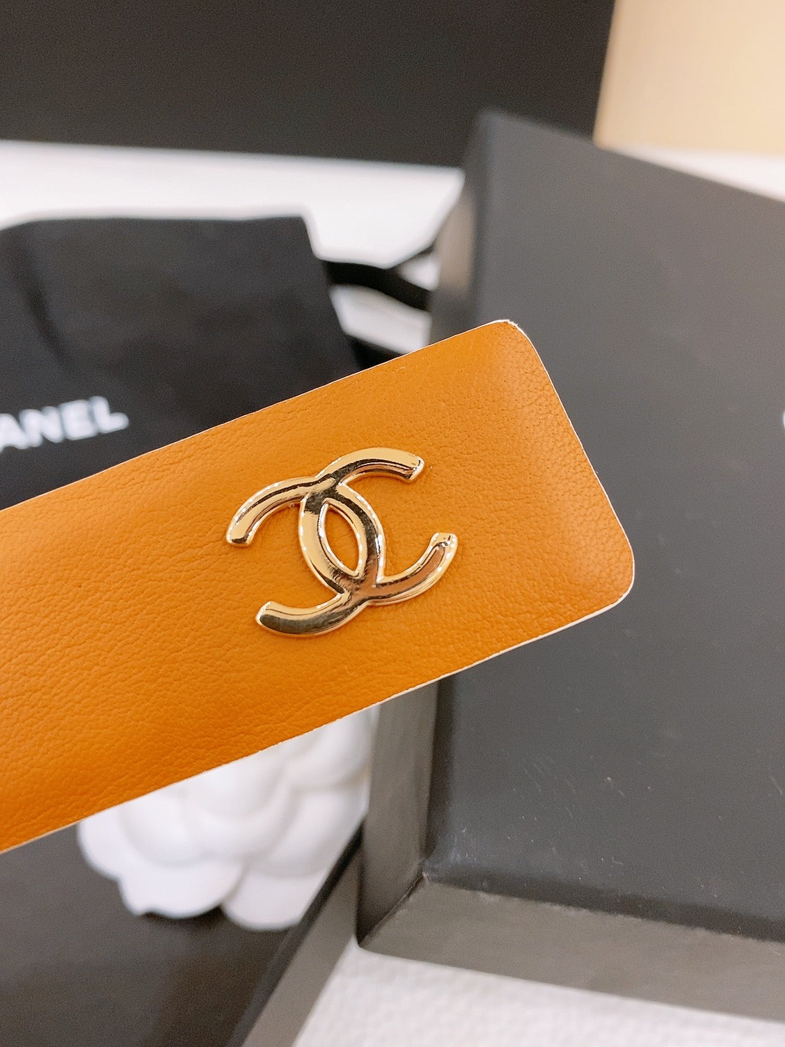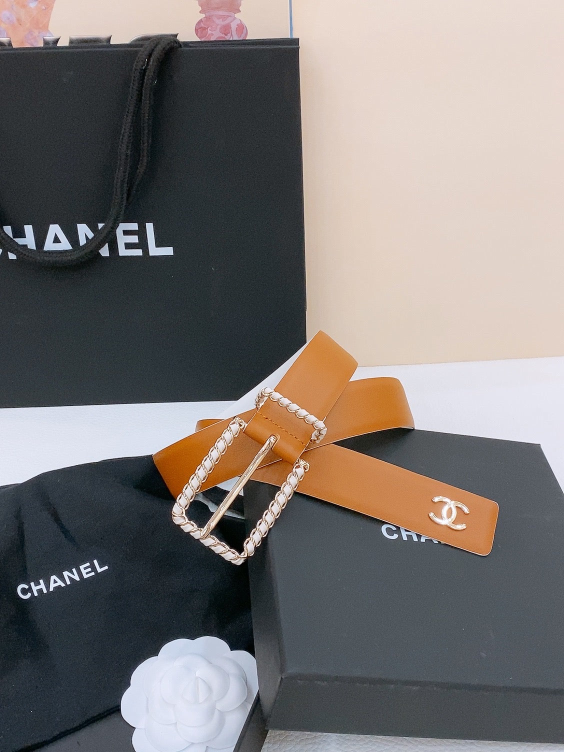 BELT 30MM IN BROWN AND WHITE CALFSKIN WITH INTERWOVEN GOLD CHAIN BUCKLE