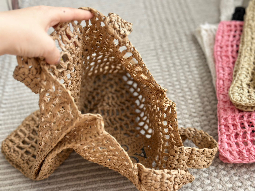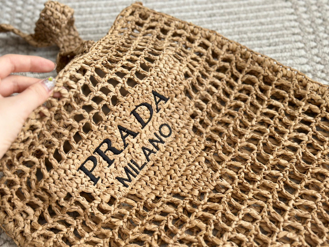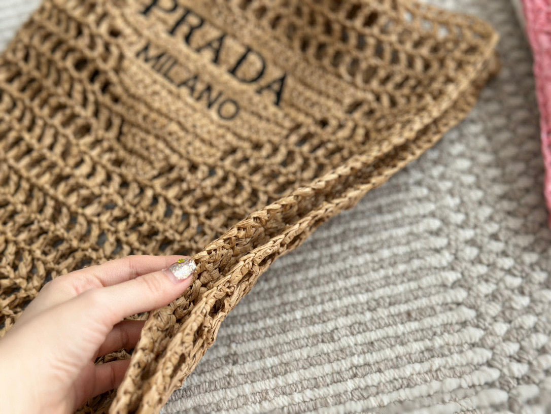 BLACK EMBROIDED LOGO TOTE BAG 40 IN BROWN WOVEN RAFFIA