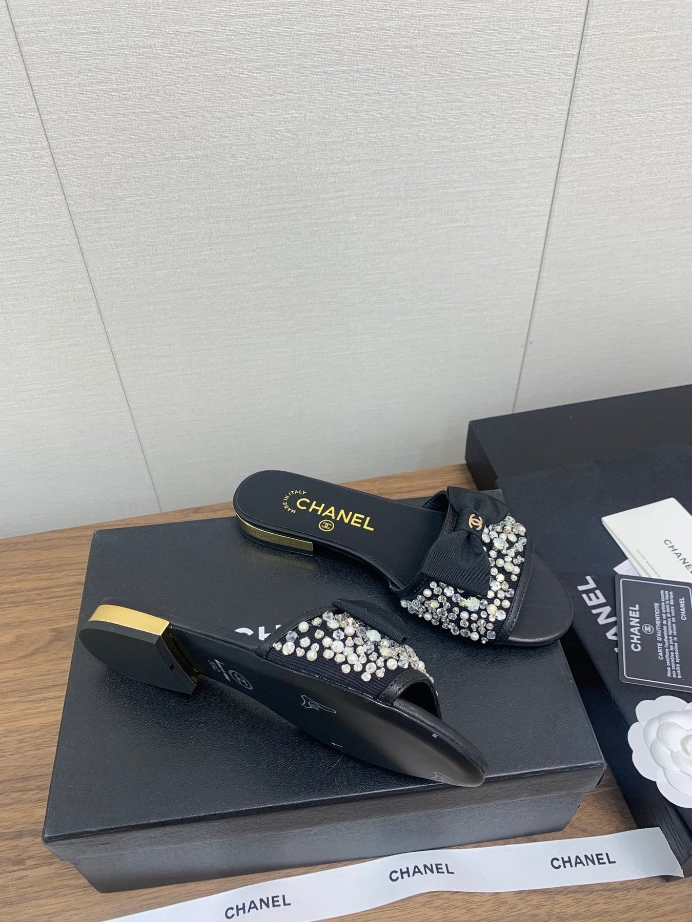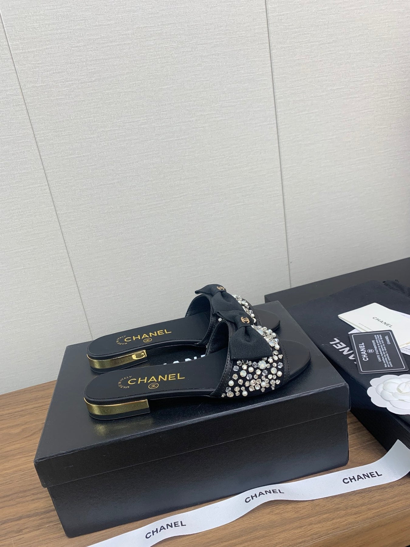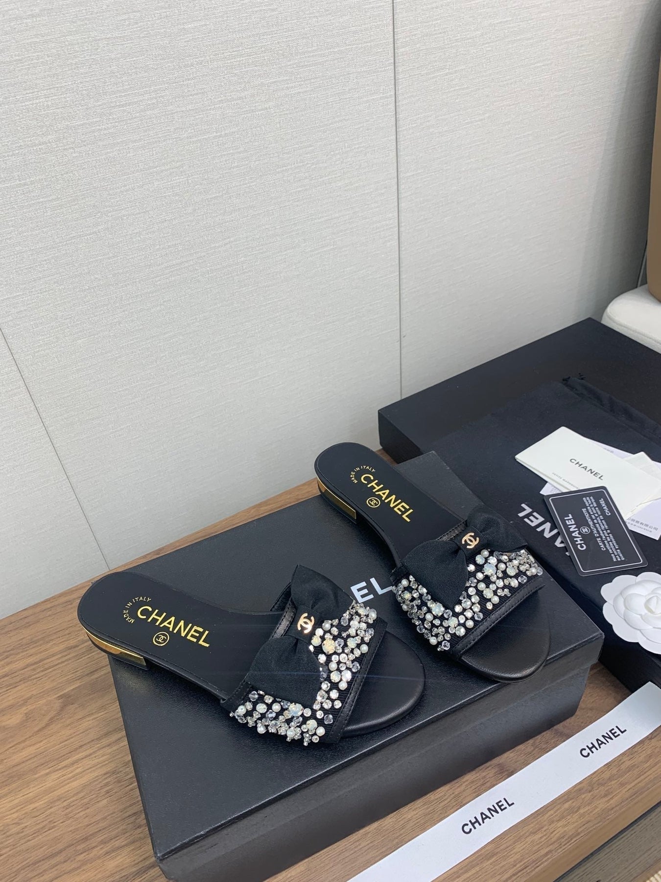 BOW SLIPPERS IN BLACK LAMBSKIN WITH RHINESTONES