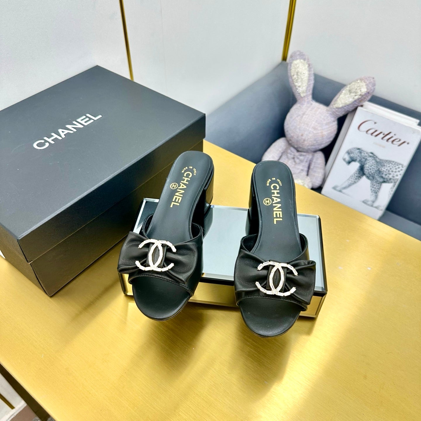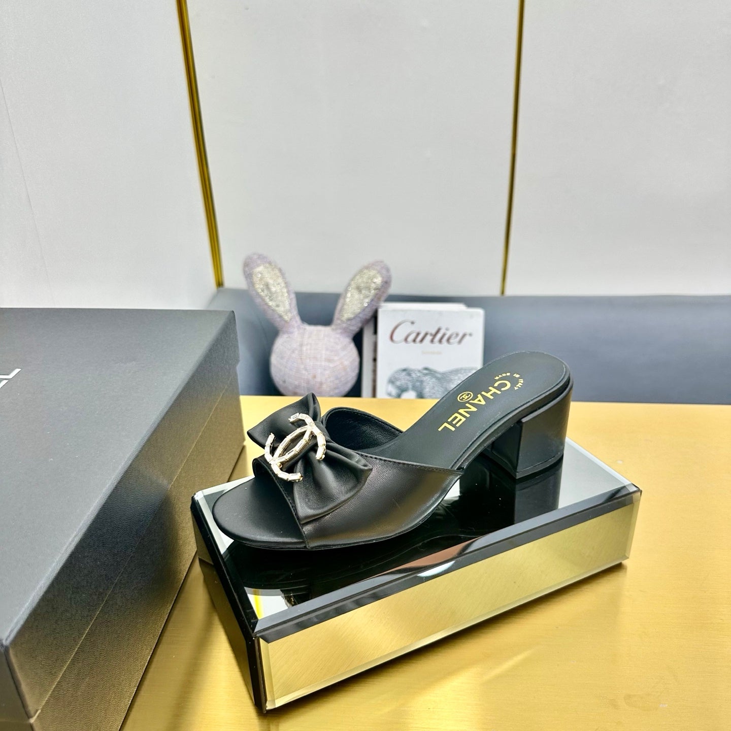 BOWKNOT RHINESTONES MID HEEL MULE IN BLACK CALFSKIN