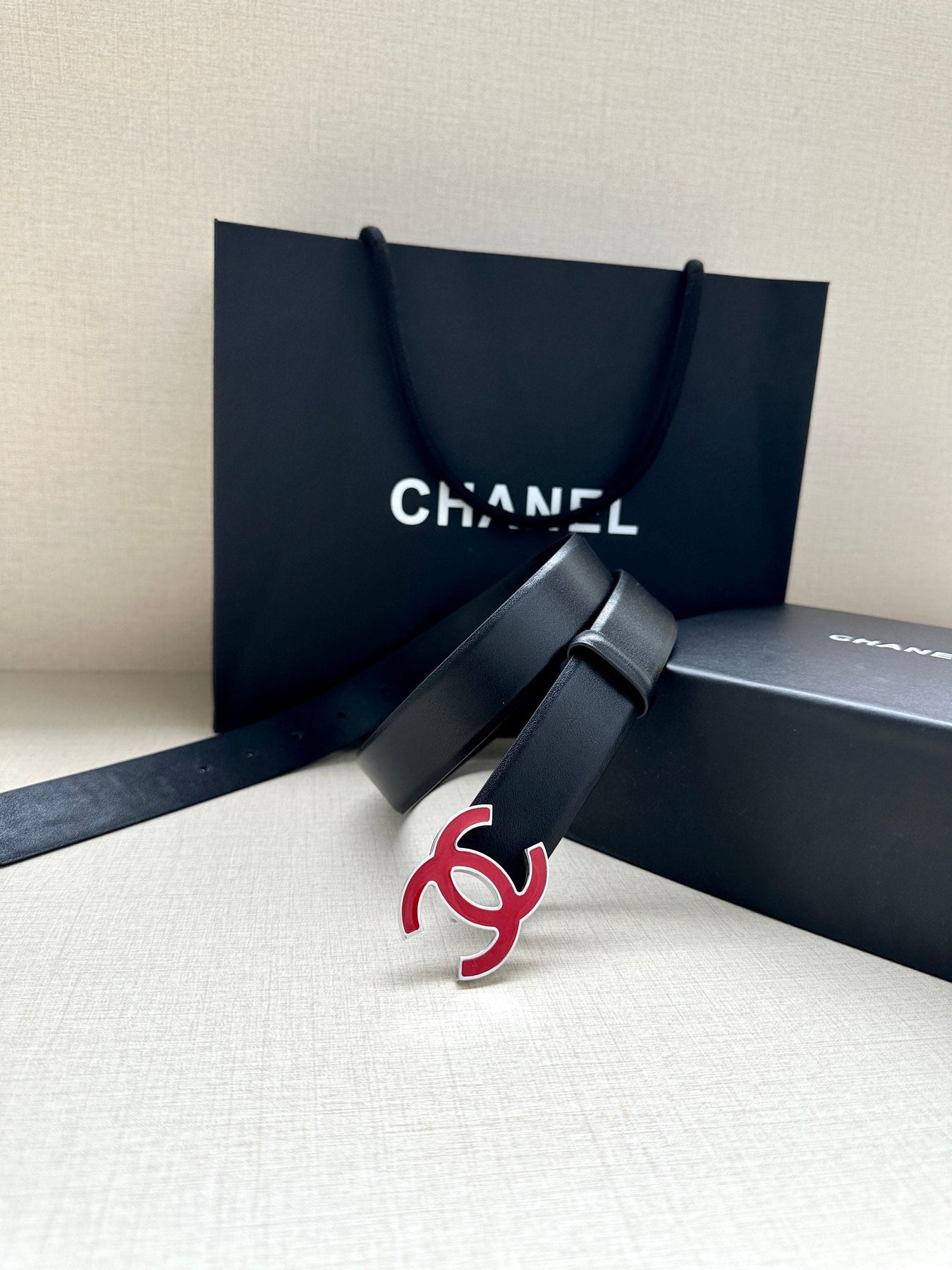 CC 30MM BELT IN BLACK SMOOTH CALFSKIN WITH RED METAL LOGO