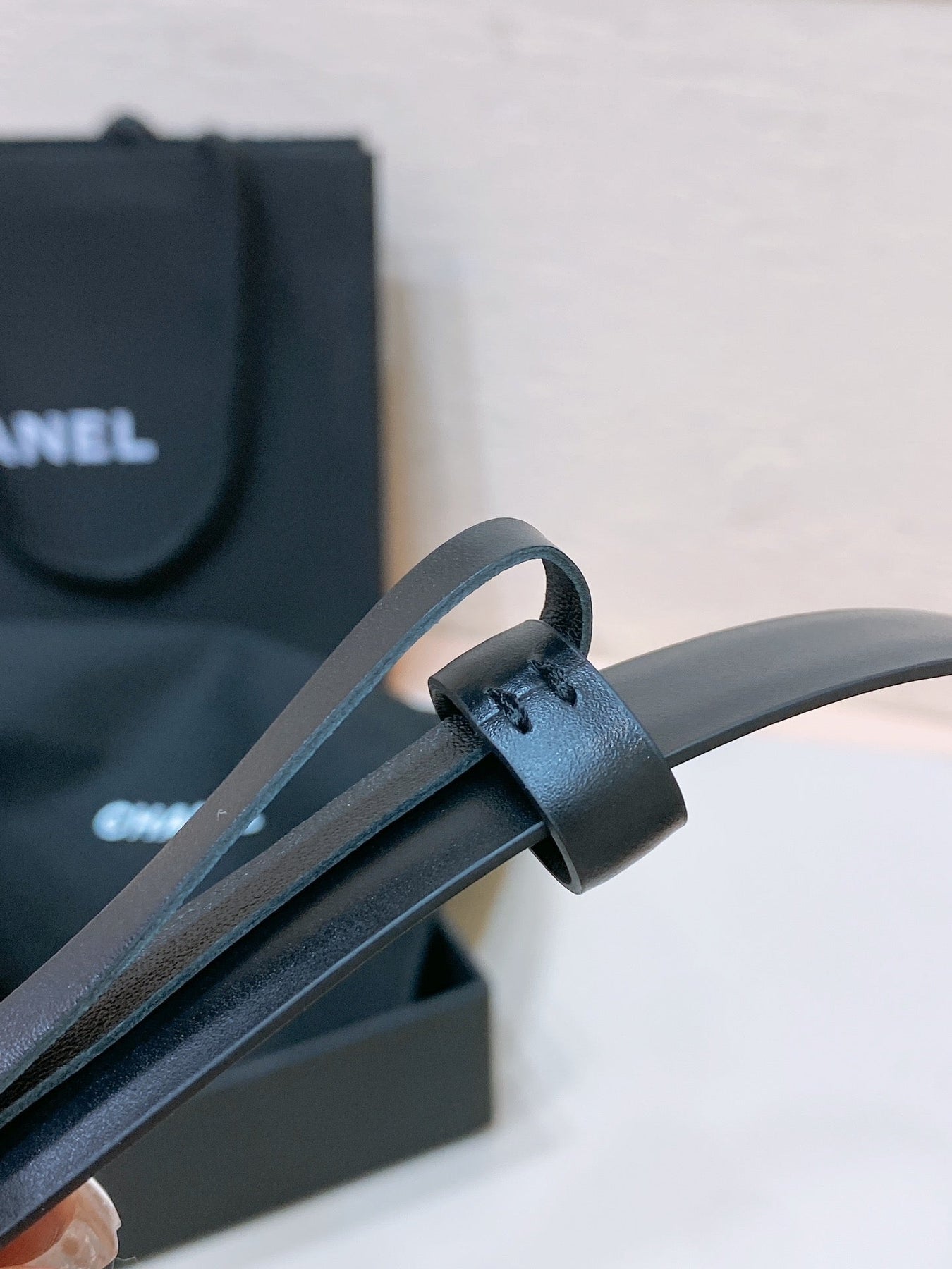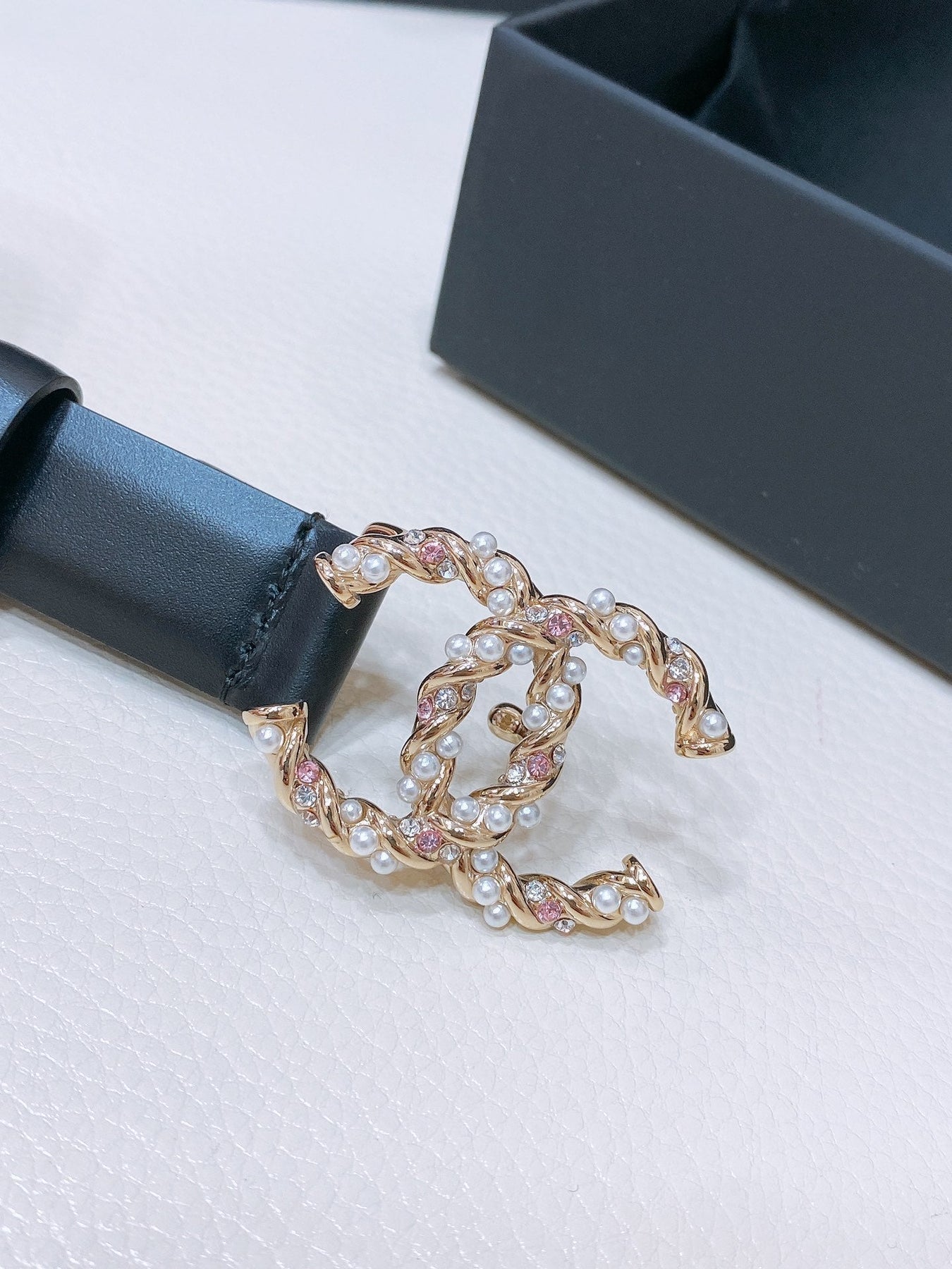 CC BELT 20MM IN BLACK CALFSKIN GOLD HARDWARE ATTACH PEARLS