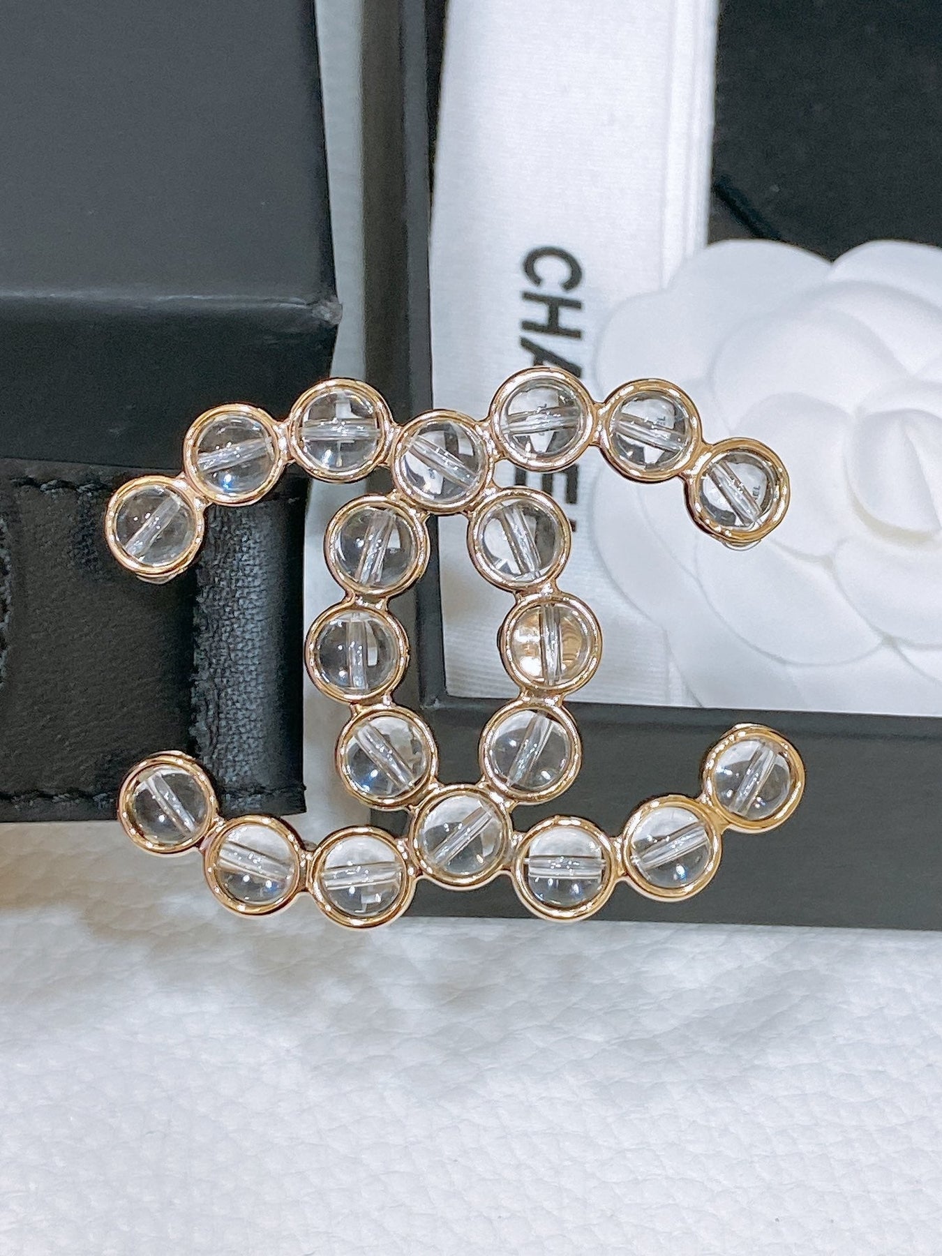 CC BELT 30 MM IN BLACK CALFSKIN PEARL LOGO WITH GOLD HARDWARE