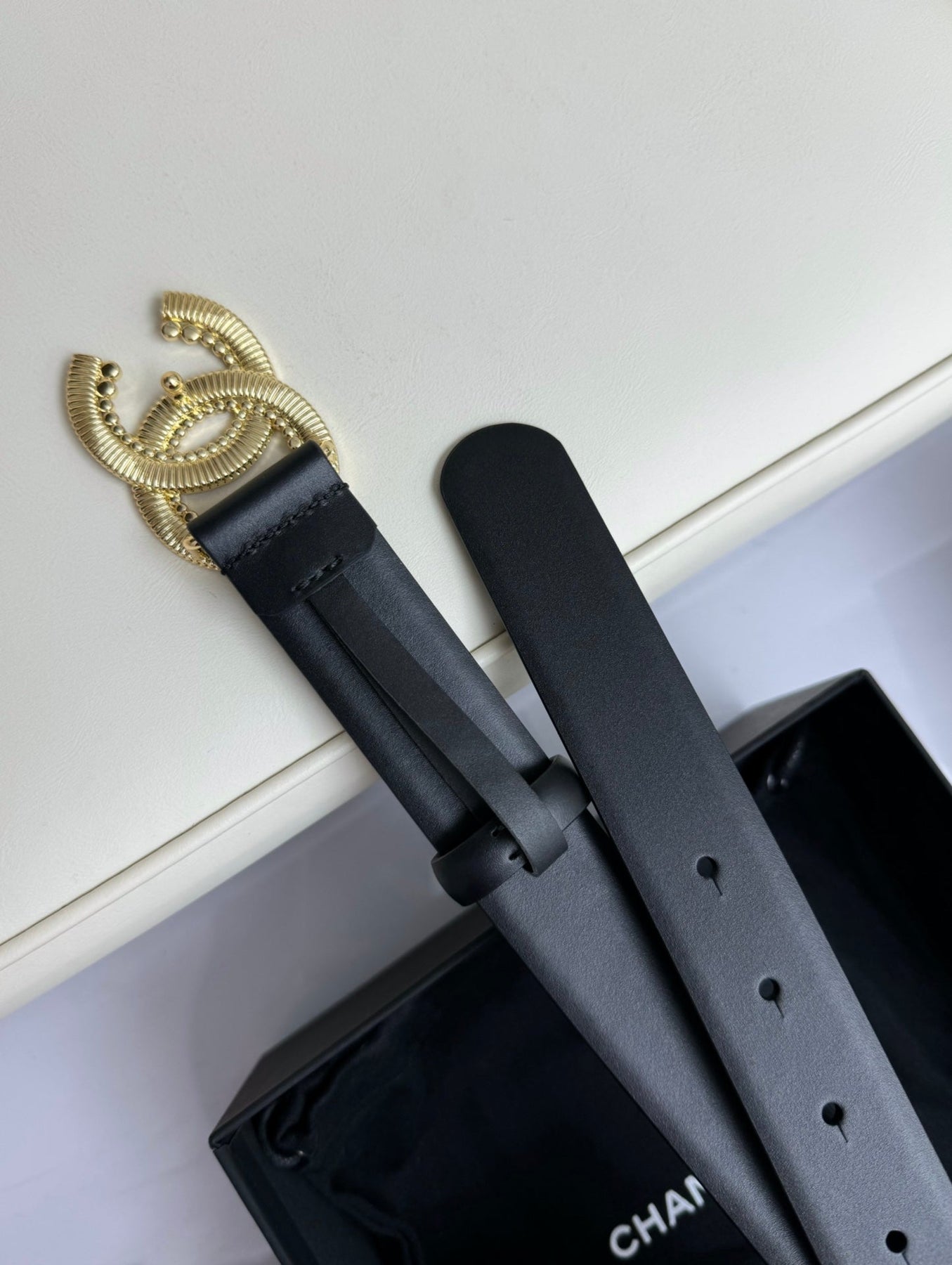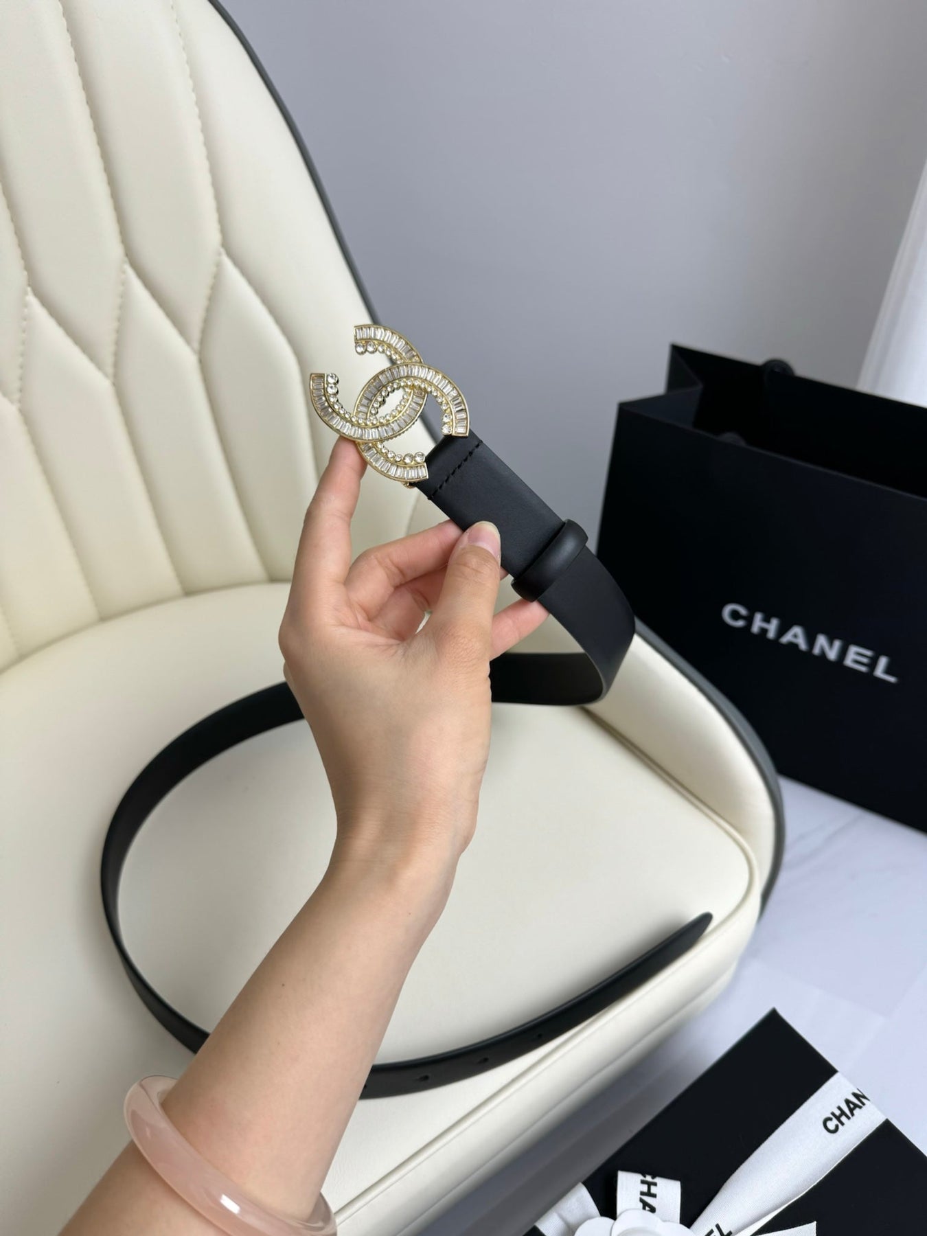 CC BELT 30MM IN BLACK SMOOTH CALFSKIN GOLD HARDWARE ATTACH RHINSTONE