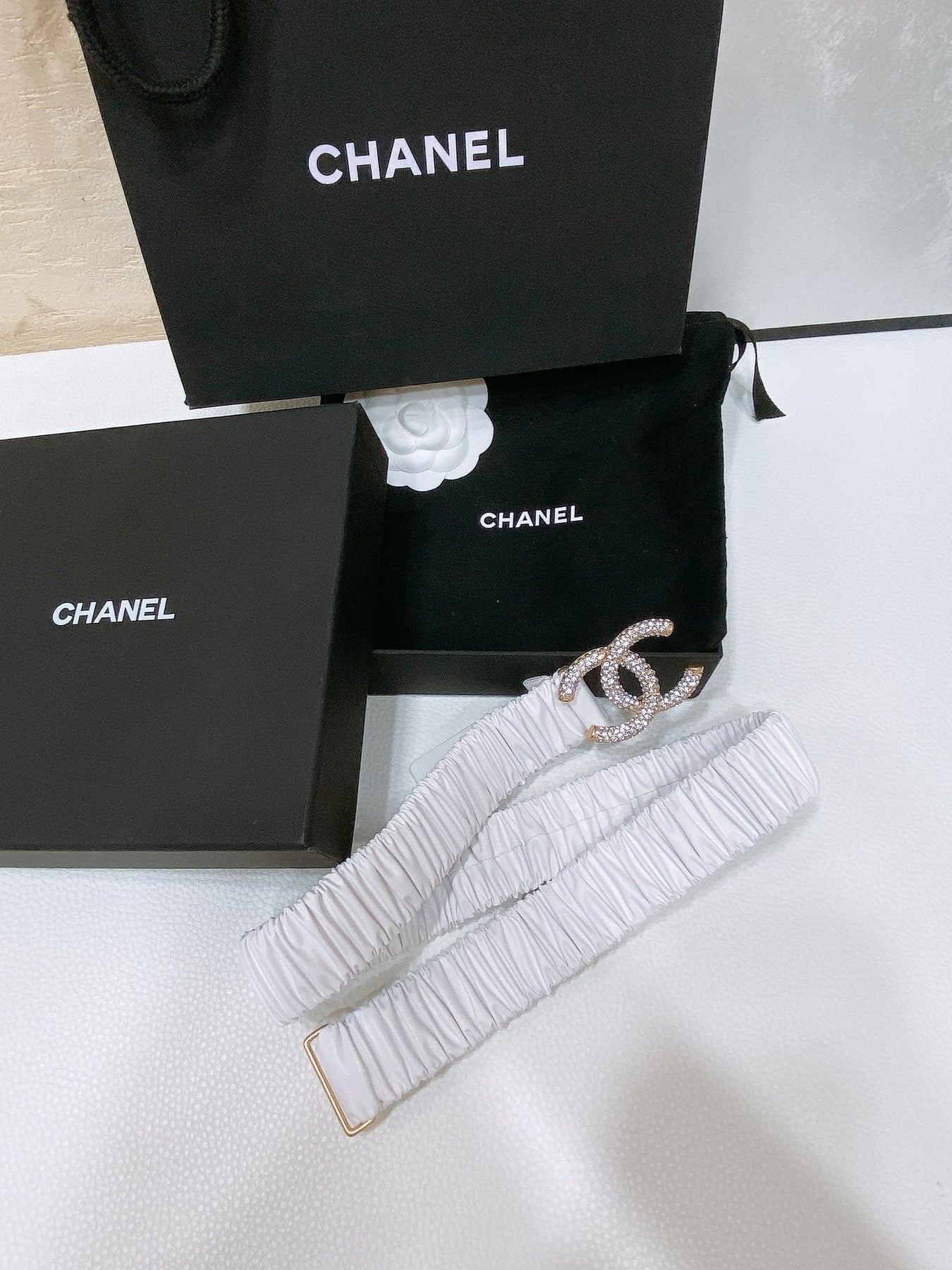 CC ELASTIC BELT 30MM IN WHITE CALFSKIN GOLD HARDWARE WITH RHINSTONES