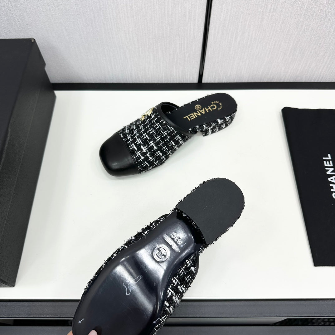 CC FLAT MULE IN BLACK MIX WHITE WOOL TWEED AND CALFSKIN