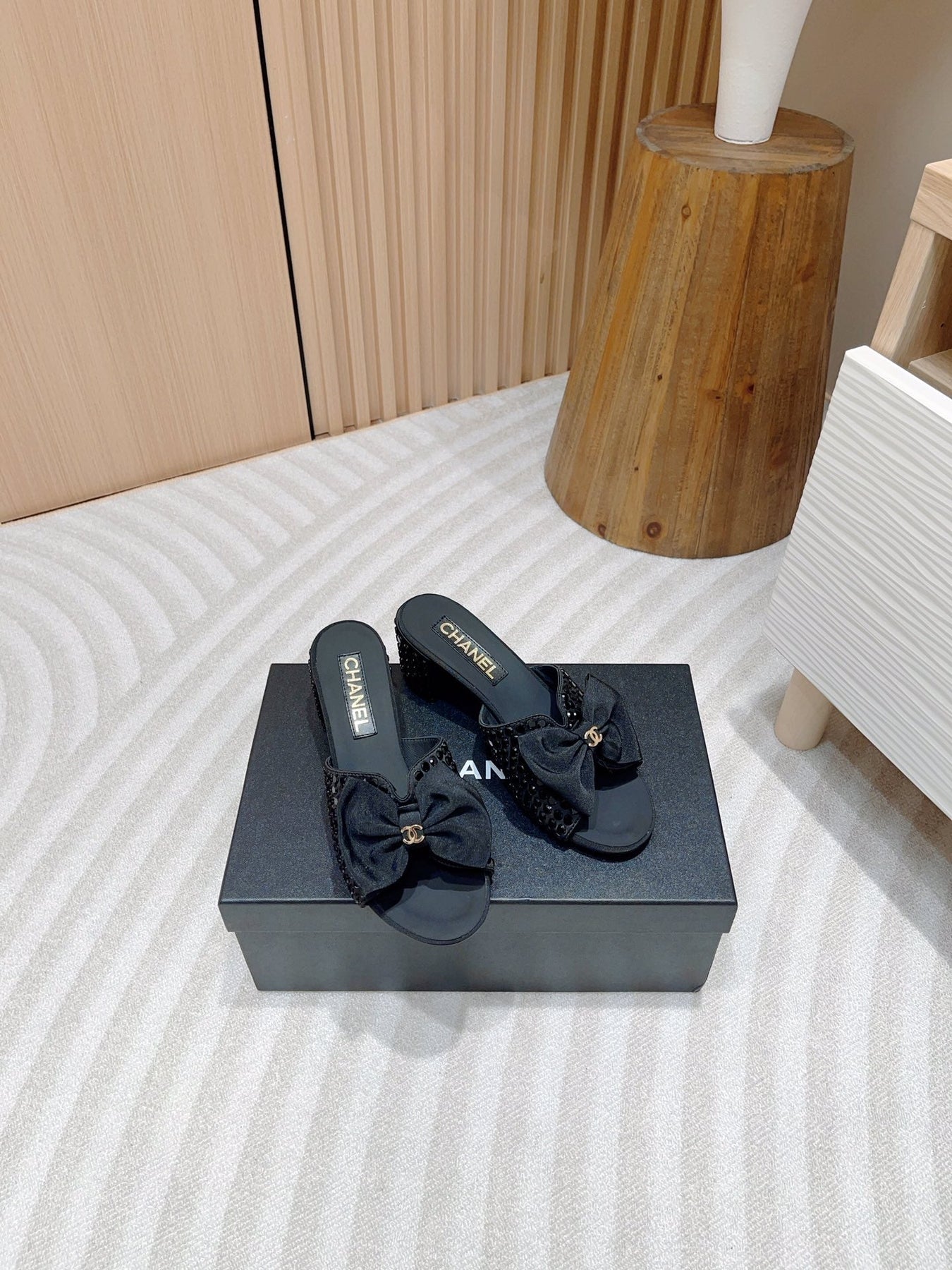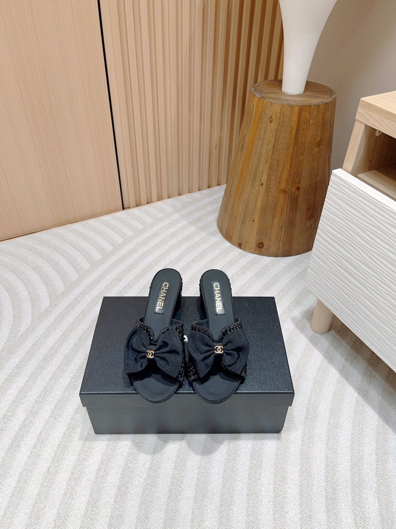 CC HIGH HEEL BLACK SATIN WITH RHINESTONES