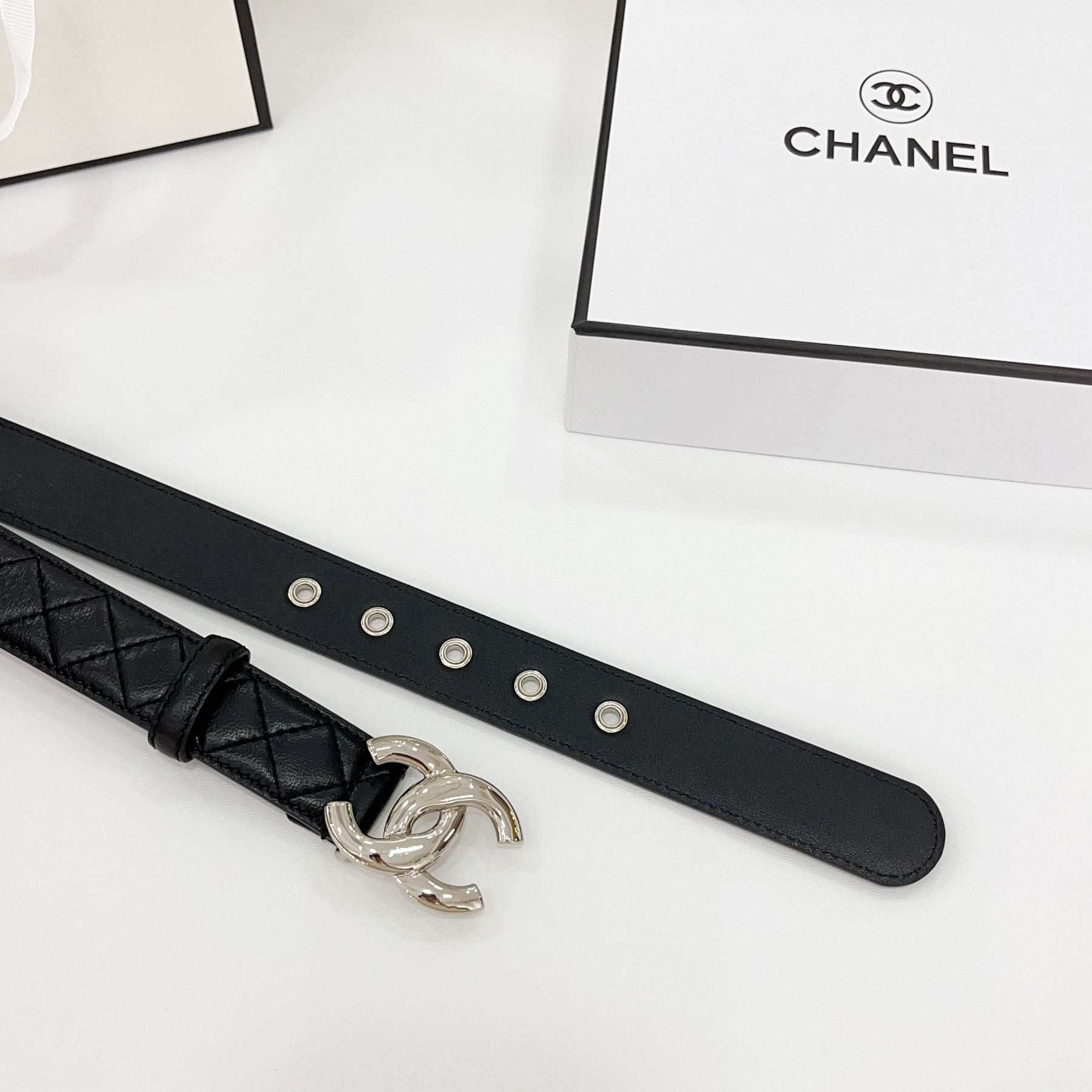 DOUBLE C BELT 30MM IN BLACK QUILTED LEATHER WITH SILVER BUCKLE