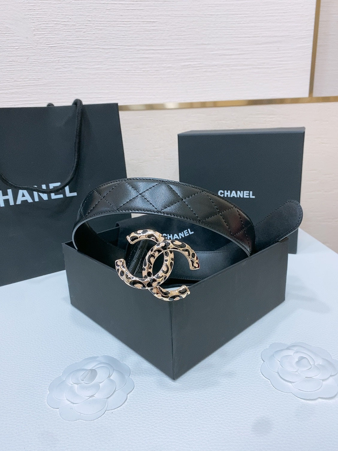 DOUBLE C BELT 38MM IN BLACK QUILTED LAMBSKIN WITH BLACK AND BEIGE LEOPARD PRINT BUCKLE