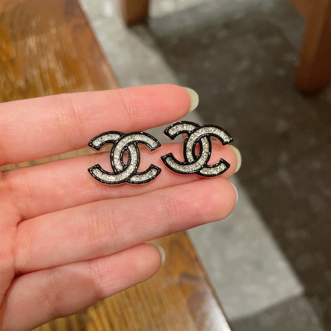 DOUBLE C STUD EARRINGS IN SILVER METAL WITH BLACK OUTLINE AND CRYSTALS INSIDE