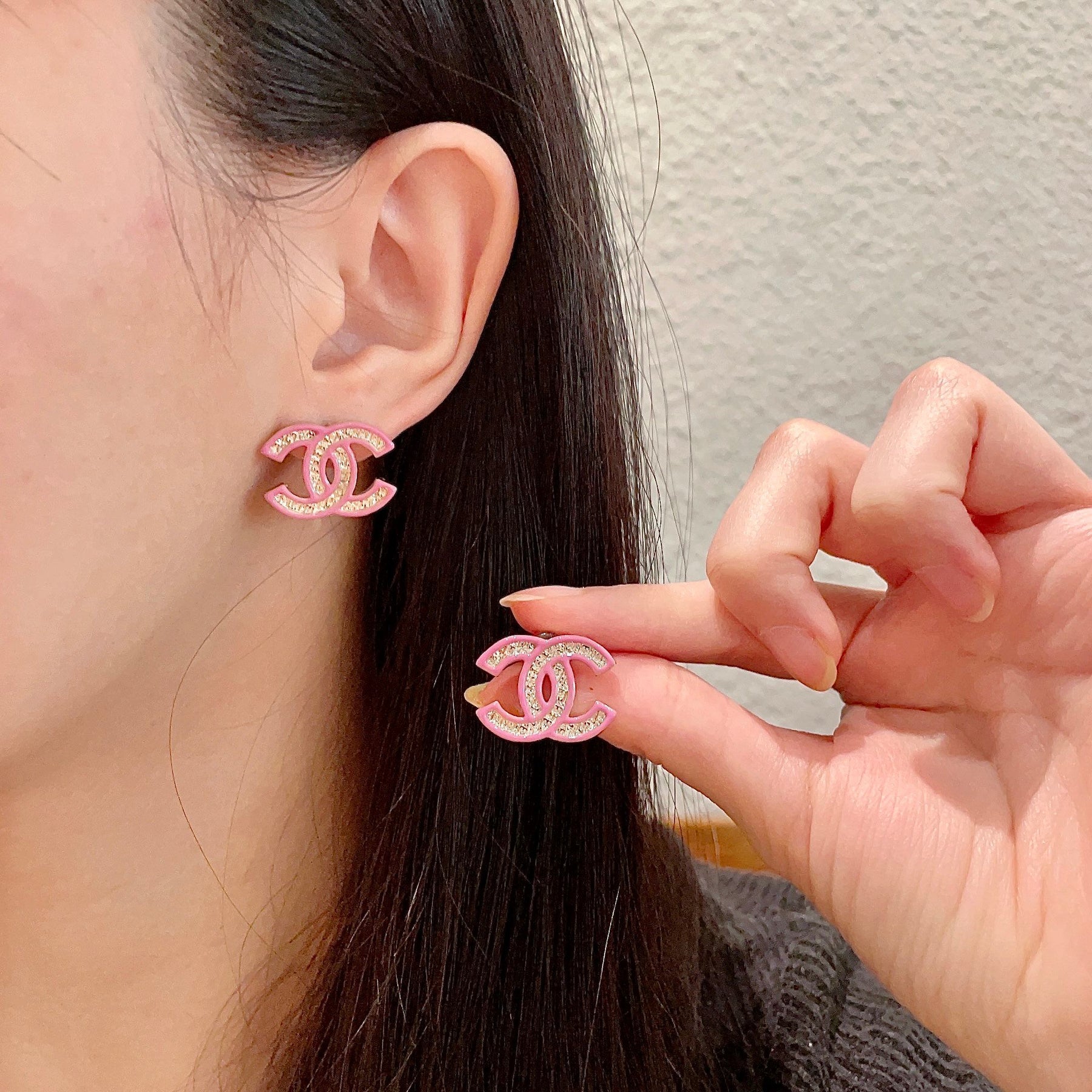 DOUBLE C STUD EARRINGS WITH PINK TRIM AND CENTER STONE