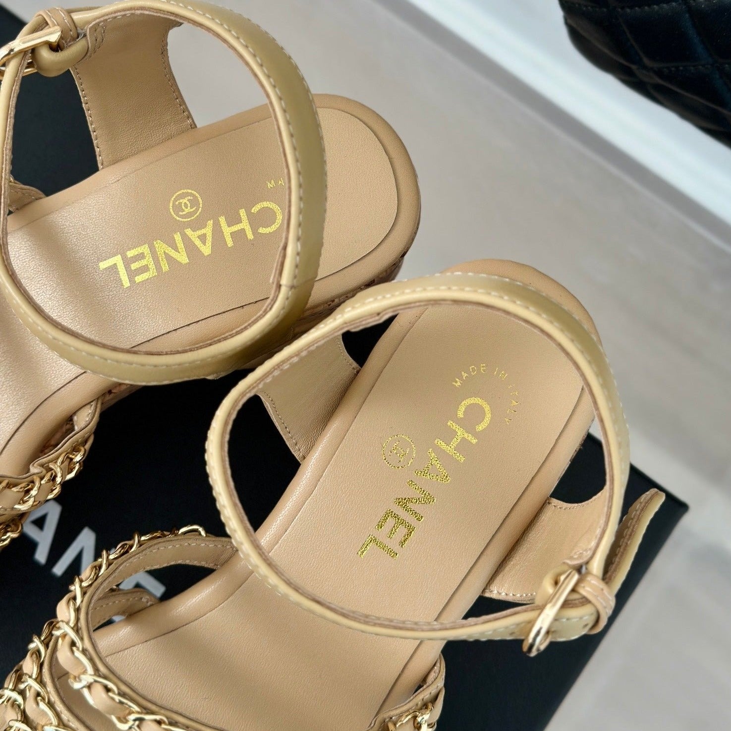 Double C Wooden Chain Platform Block Heel Sandals Beige Cream