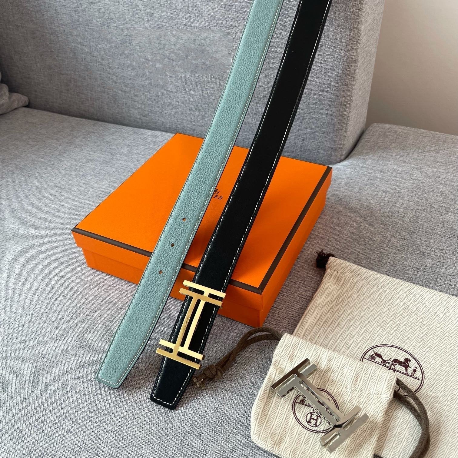 DOUBLE H REVERSIBLE BELT 32MM GOLD BUCKLE BLACK SKY BLUE LEATHER