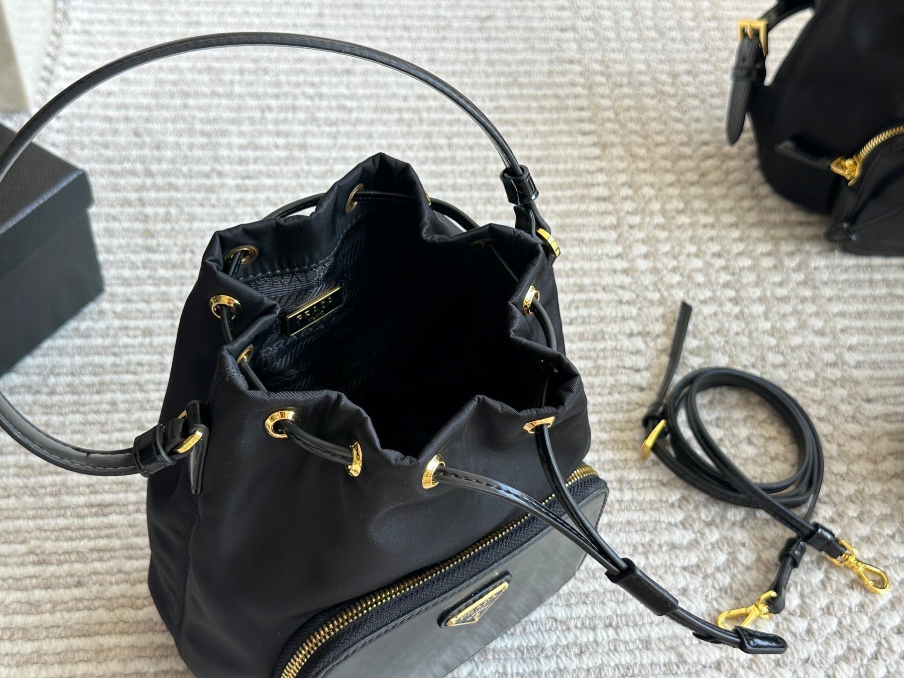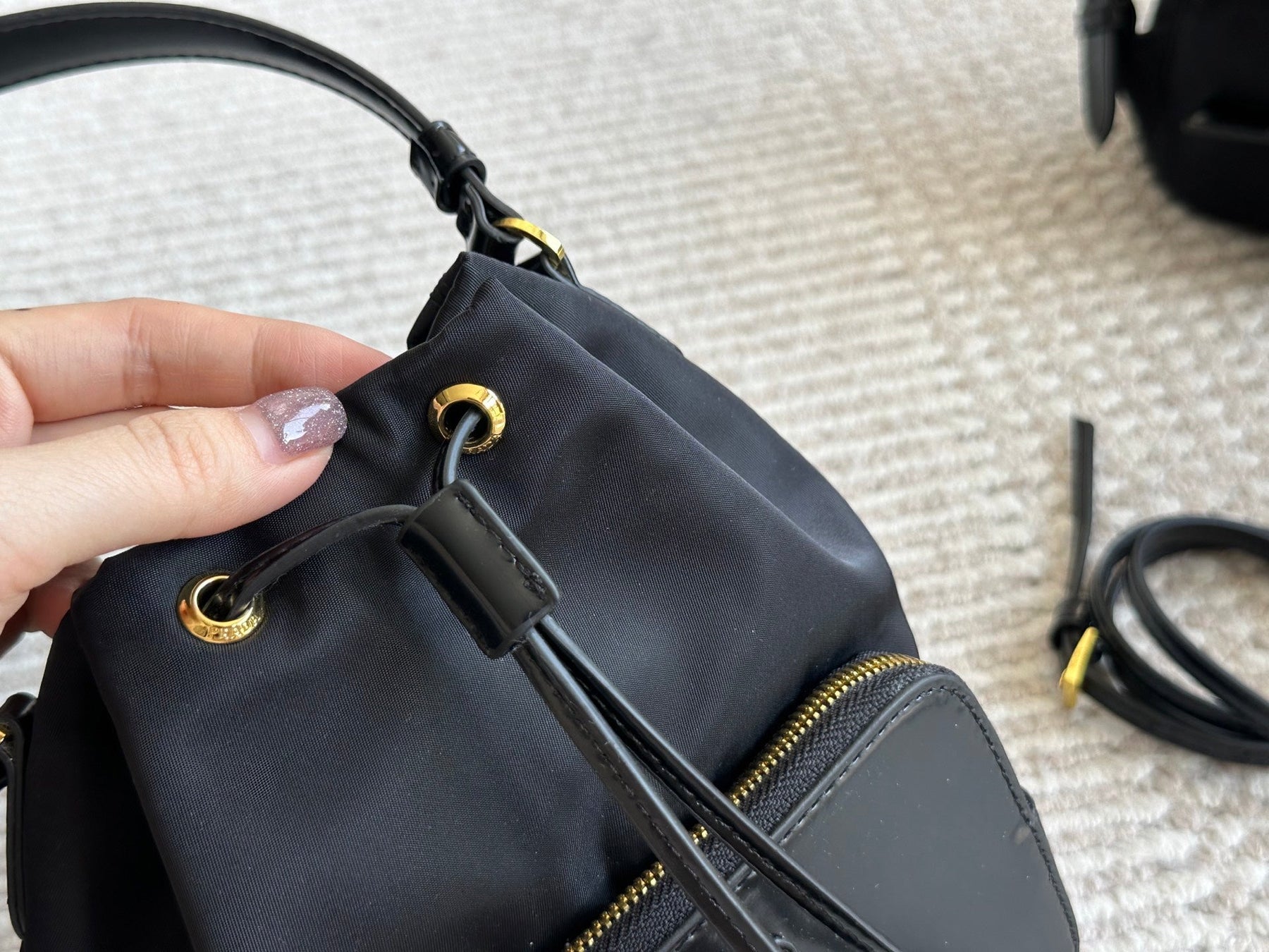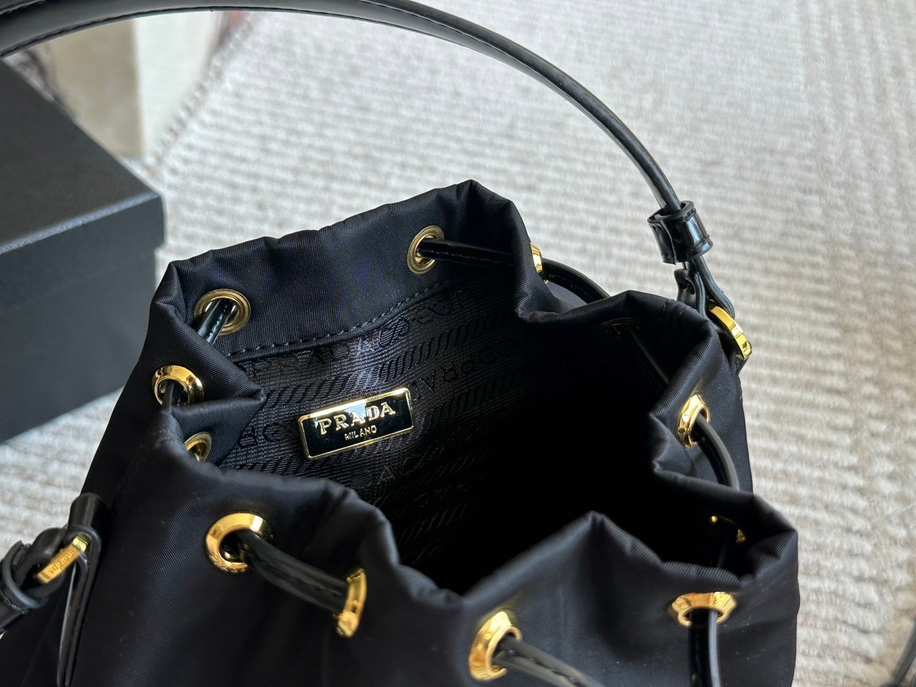 DRAWSTRING HOBO BAG 21 IN BLACK RE-NYLON AND CALFSKIN HANDLE