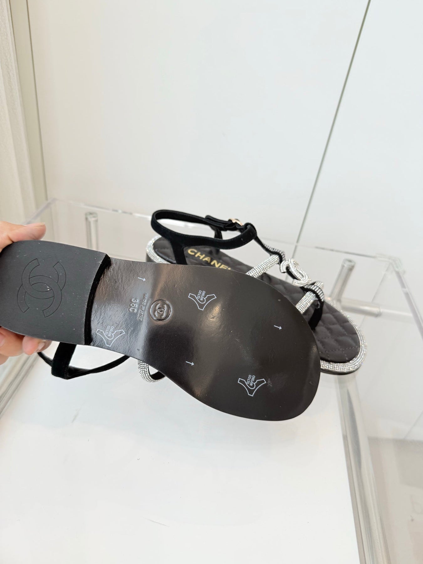 FLAT SANDALS IN BLACK SOFT LEATHER WITH SILVER STONE