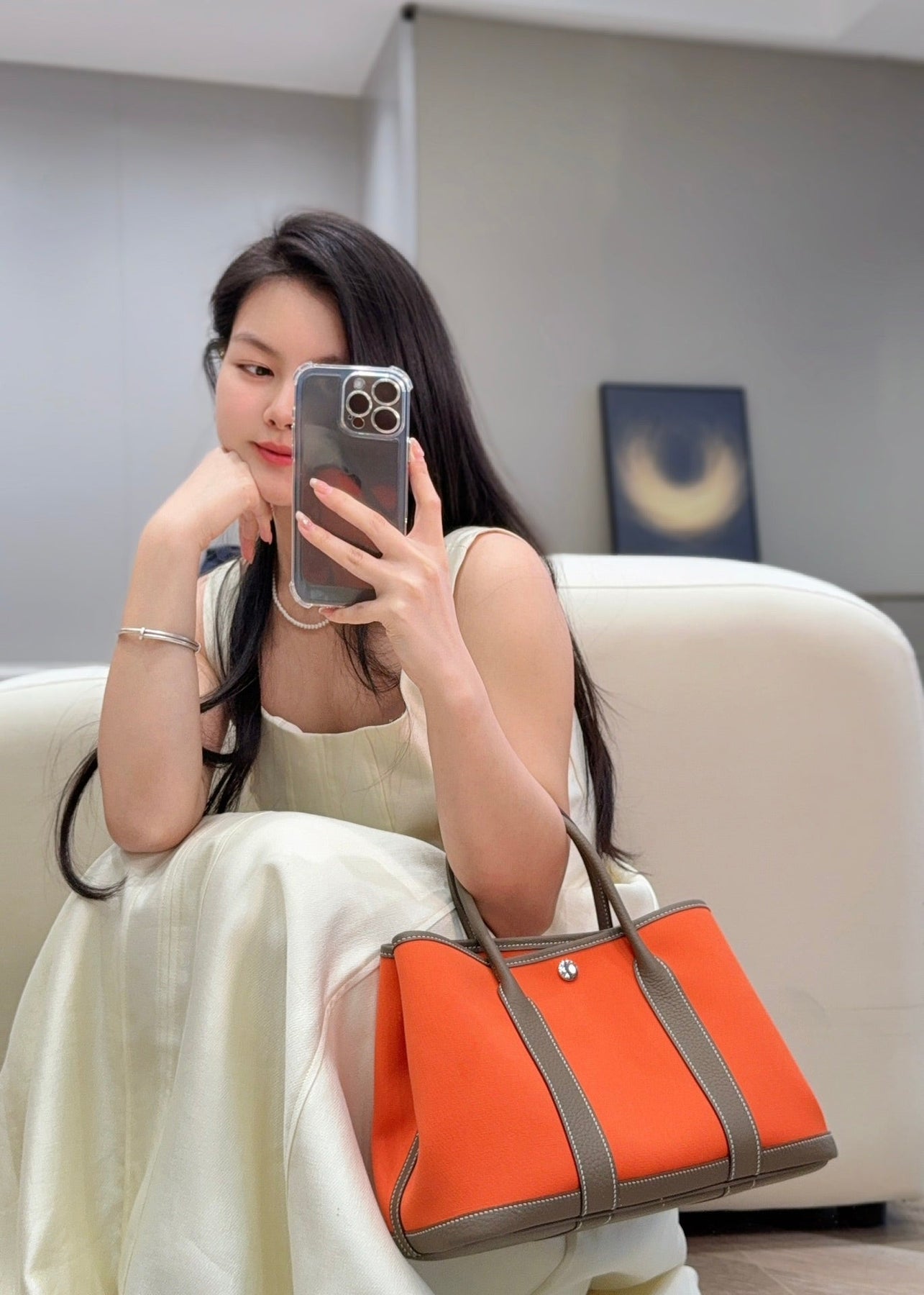 GARDEN PARTY 30CM IN ORANGE MINIMUM TOILETS COTTON CANVAS AND BROWN CALFSKIN