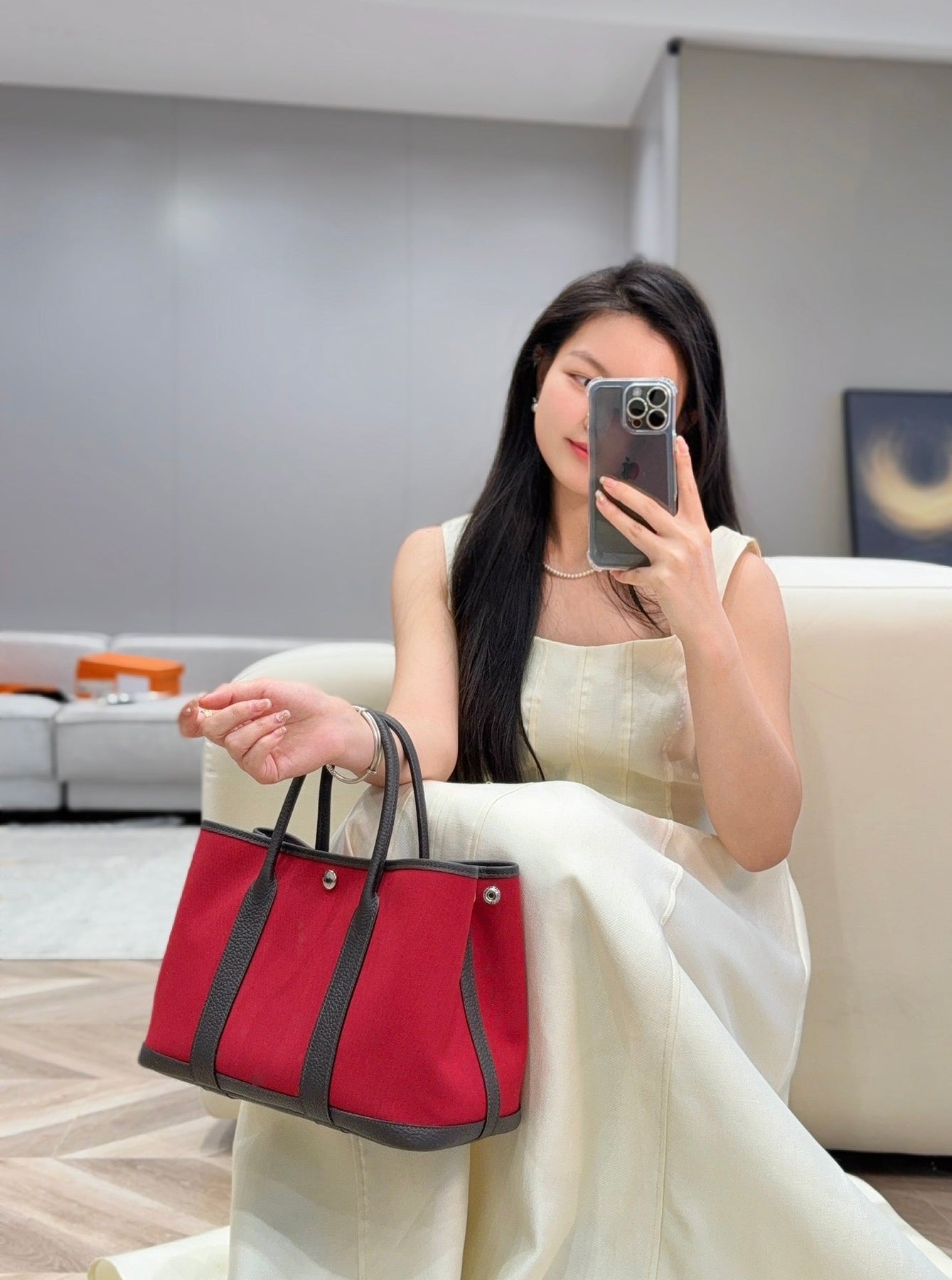 GARDEN PARTY 30CM IN RED TOILETS COTTON CANVAS AND DARK BROWN CALFSKIN PINK ON SIDE OTHER