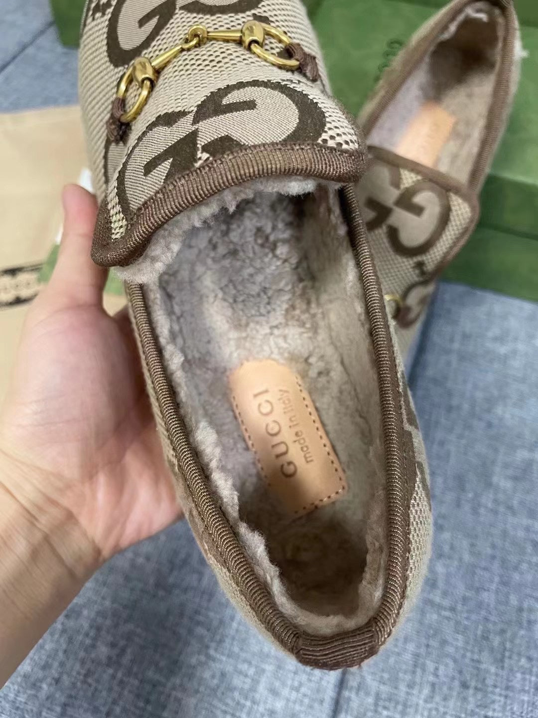 GG HORSEBIT LOAFER IN ECRU BEIGE WOVEN FABRIC AND WOOL MIX LAMB FUR LINING