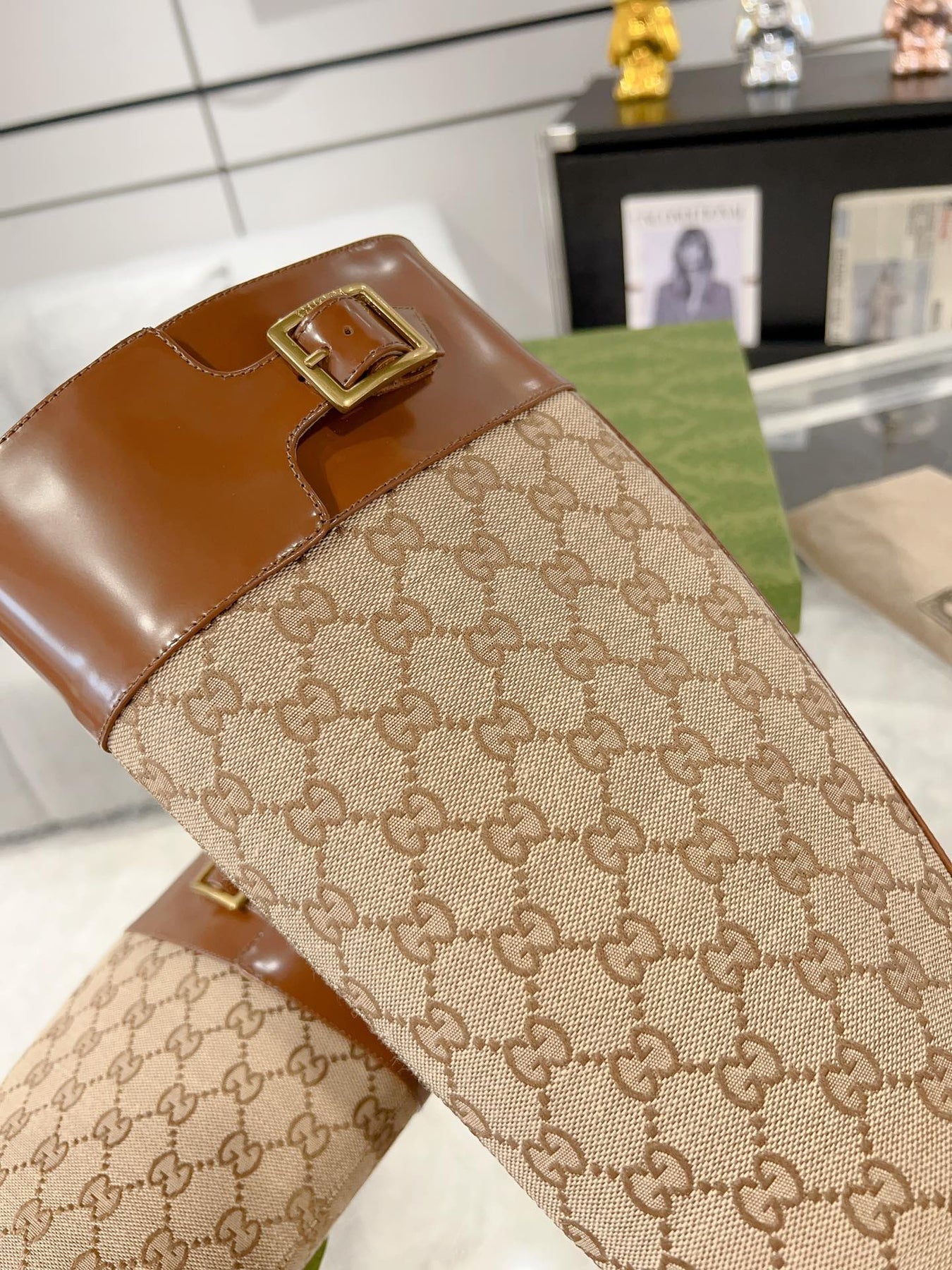 GG KNEE BOOTS IN BRONZE BROWN MONOGRAM CANVAS AND GLOSSY SHEEPSKIN