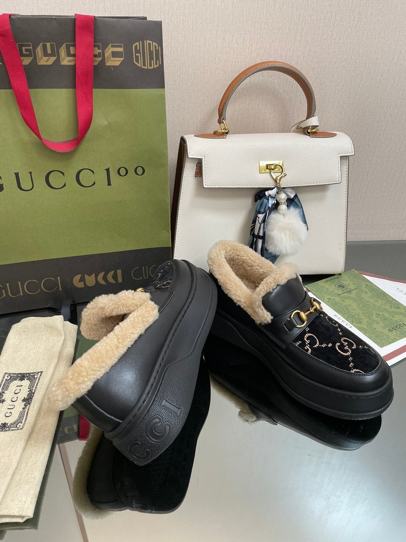 GG LOAFER IN BLACK JACQUARD AND CALFSKIN WITH BEIGE WOOL LINING