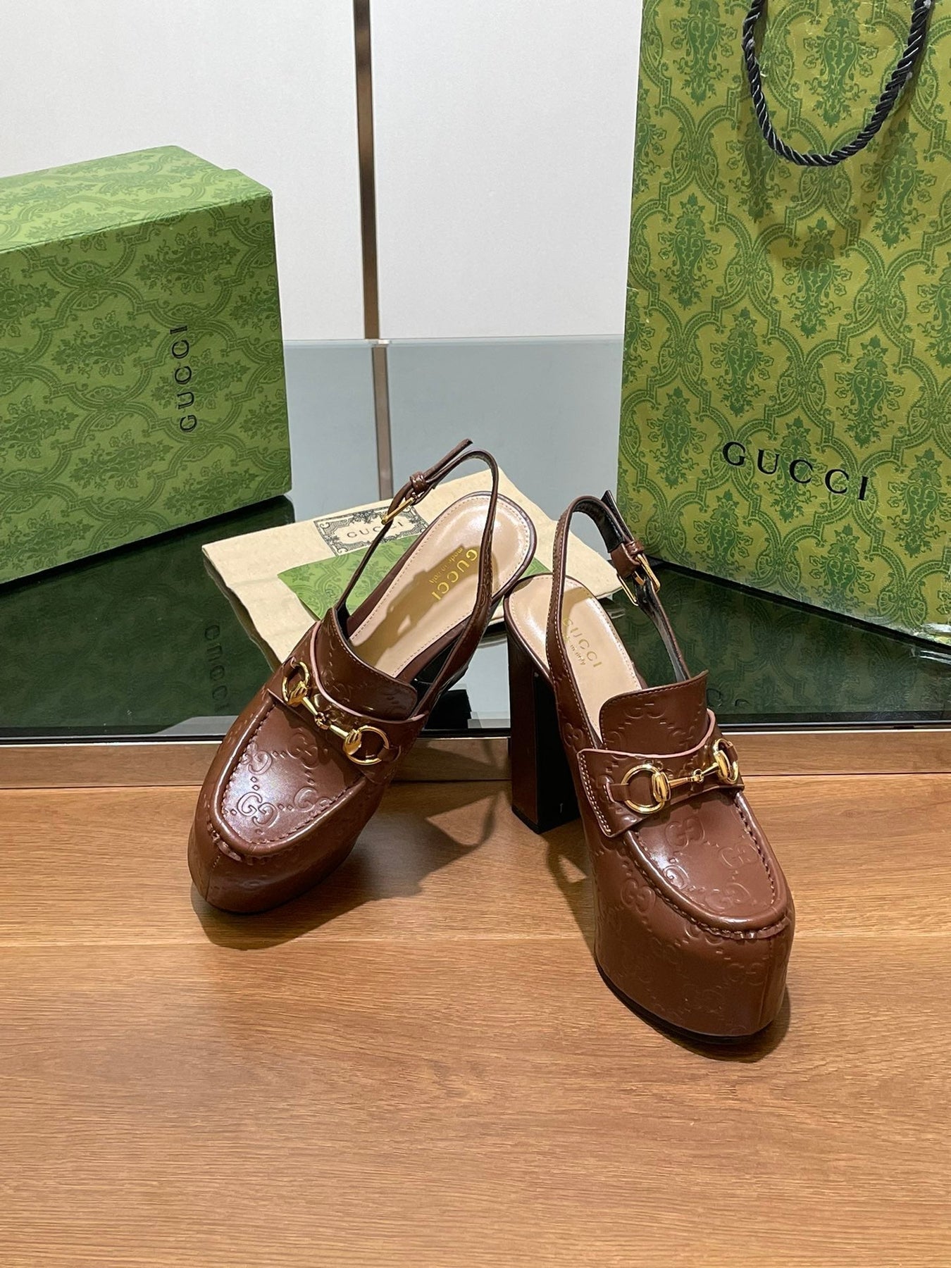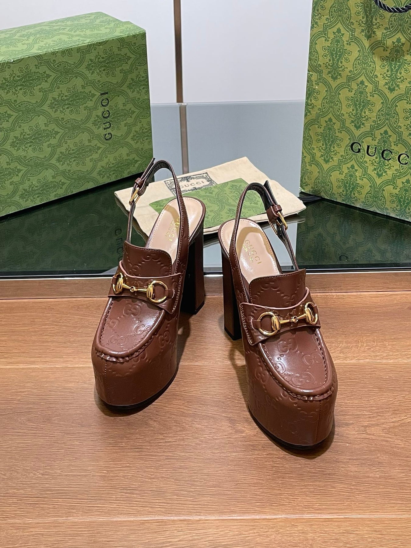 GG WOMEN'S HORSEBIT PLATFORM LOAFER SLINGBACK IN DARK BROWN EMBOSSED CALFSKIN