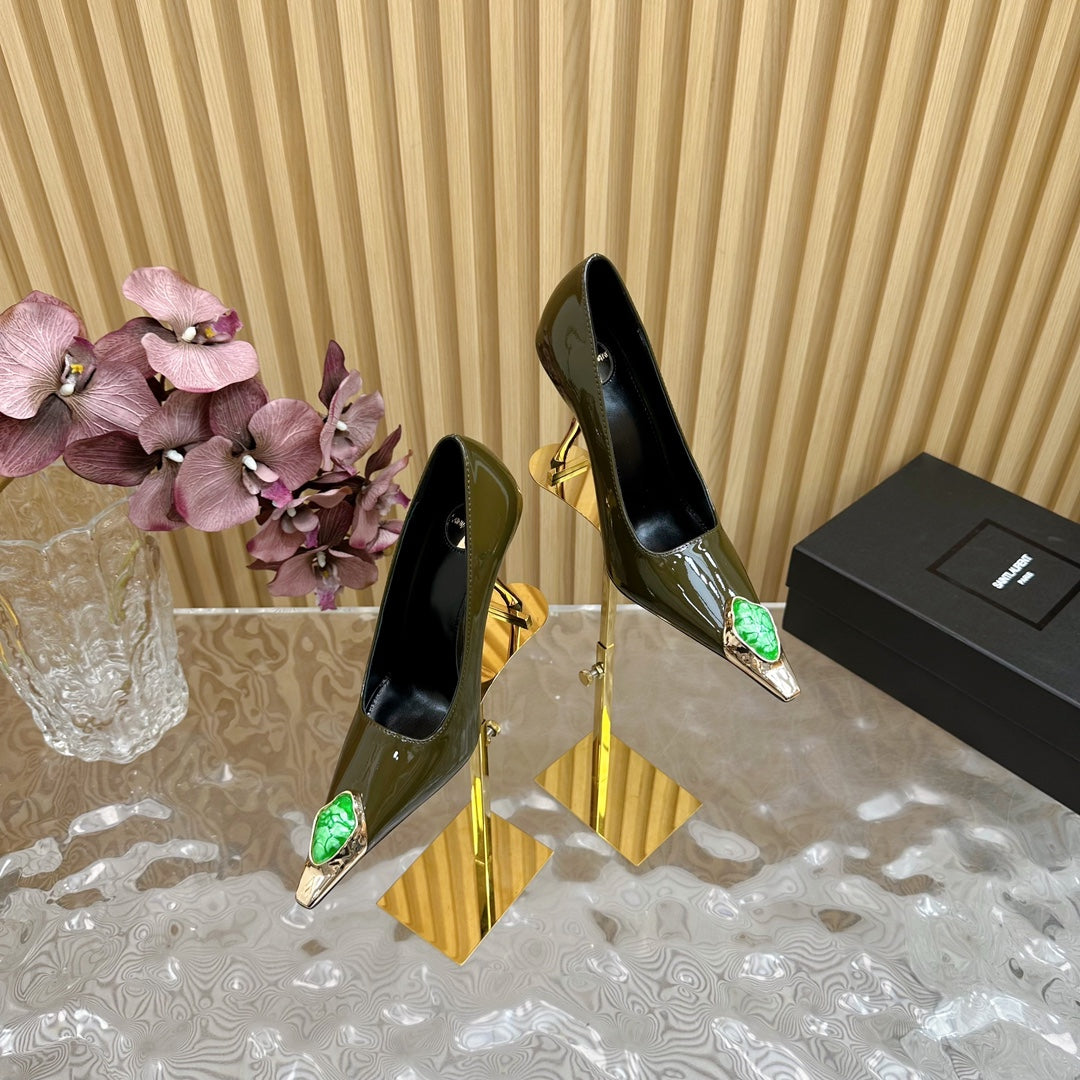 GREEN GEM-STUDDED HIGH PUMPS IN ARMY GREEN PATENT CALFSKIN
