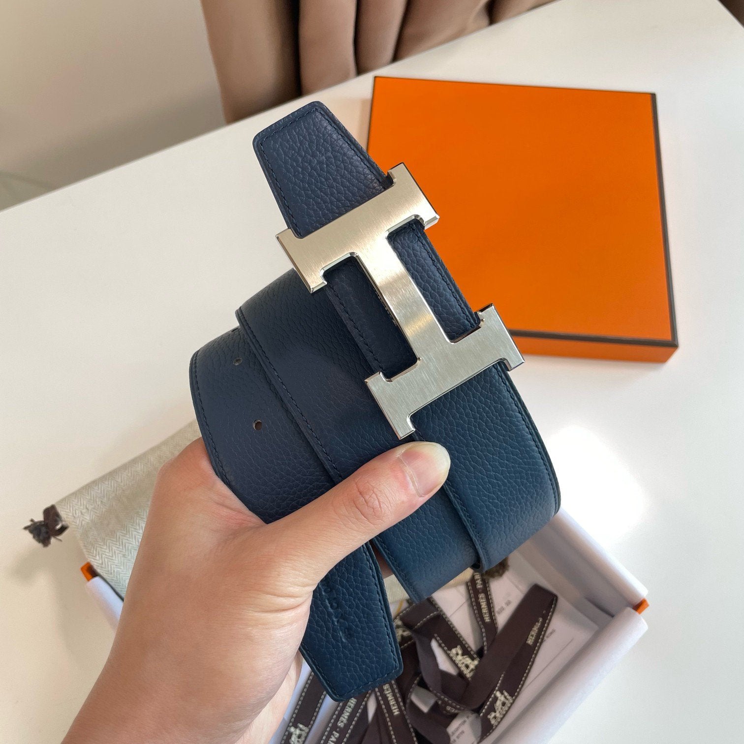 H CONTANCE BELT 38MM SILVER BUCKLE BLACK BLUE LEATHER