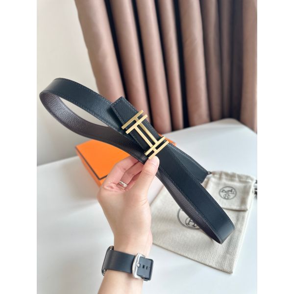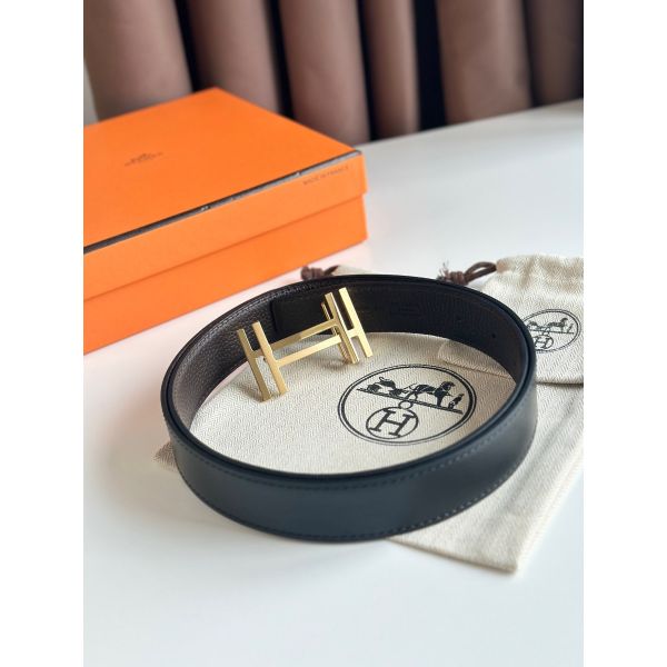 HERM H au Carre Reversible Belt 32MM in Chocolate Clemence Leather