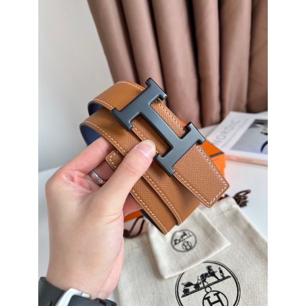 HERM H Reversible 38MM Belt with matte Buckle in Blue and Gold Epsom Leather