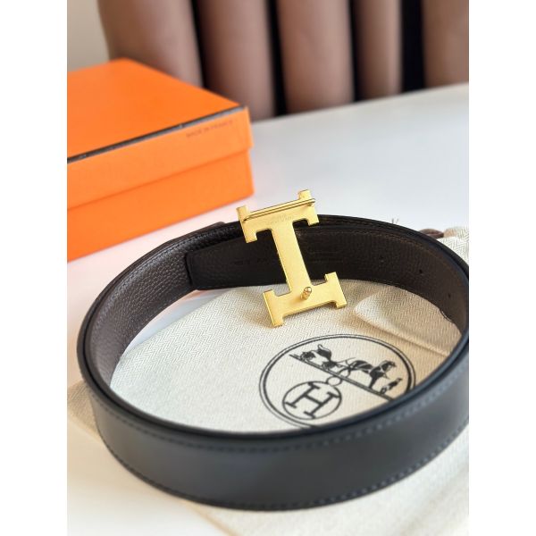 HERM H Reversible Belt 32MM in Chocolate Clemence Leather