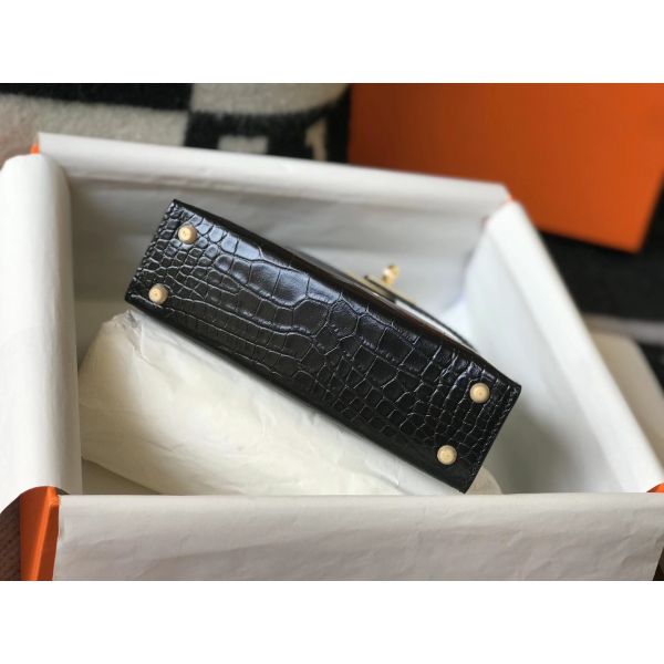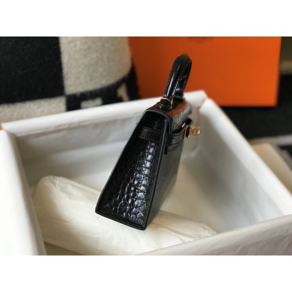 HERM Kelly Mini II Bag In Black Embossed Crocodile Leather