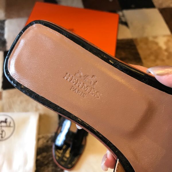 HERM Oran Slide Sandals In Black Shiny Niloticus Crocodile Skin