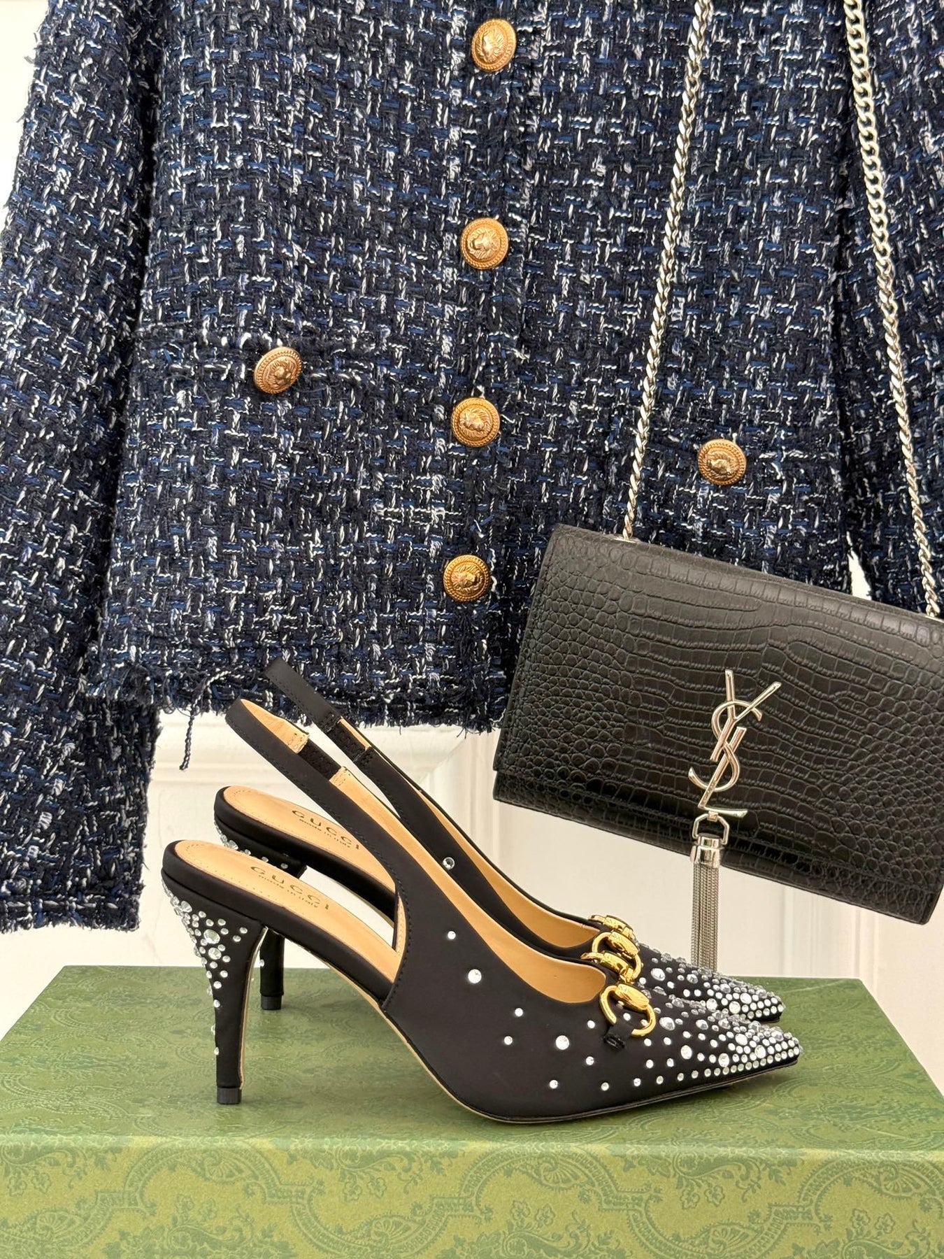 HIGH SLINGBACK 8.5 CM IN BLACK FABRIC WITH RHINESTONE EMBELLISHMENTS