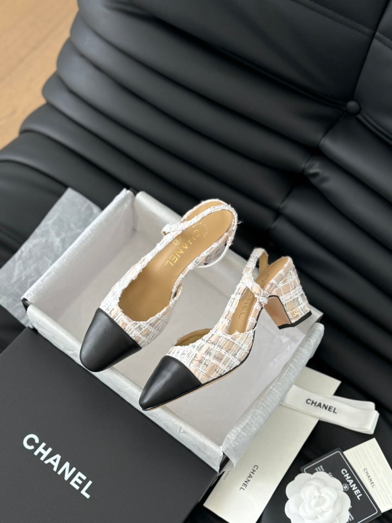 HIGH SLINGBACK IN BEIGE TWEED AND BLACK LAMBSKIN