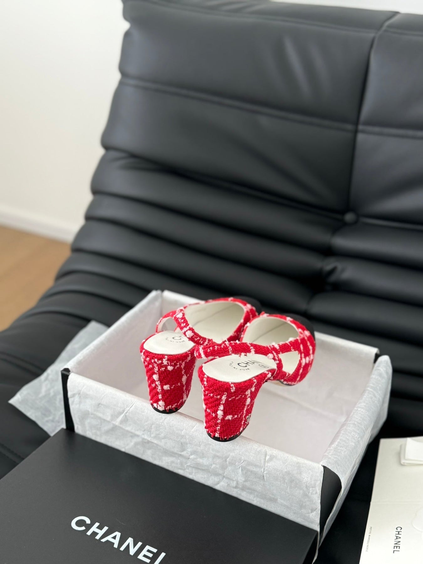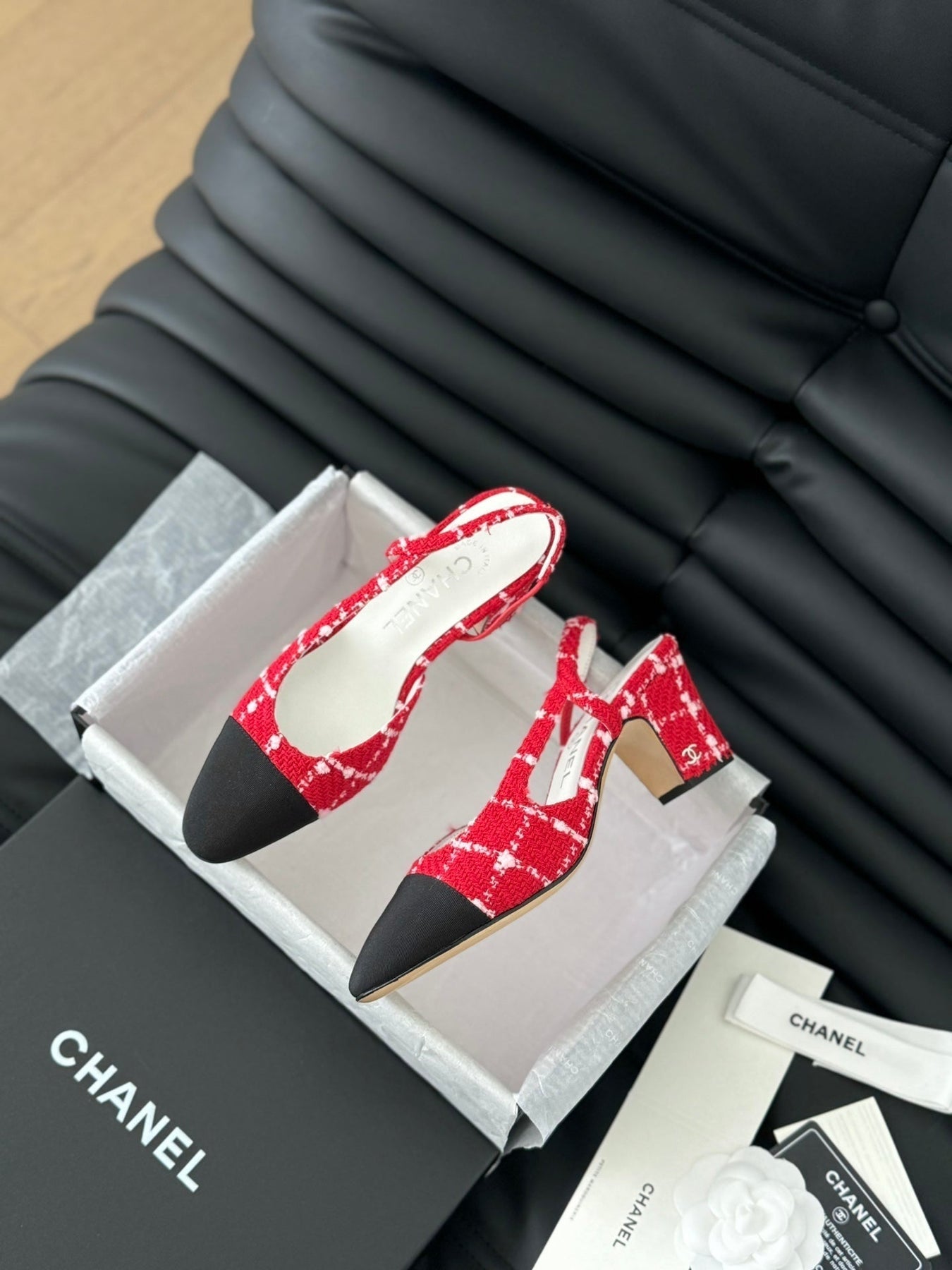 HIGH SLINGBACK IN CHERRY RED TWEED AND BLACK LAMBSKIN