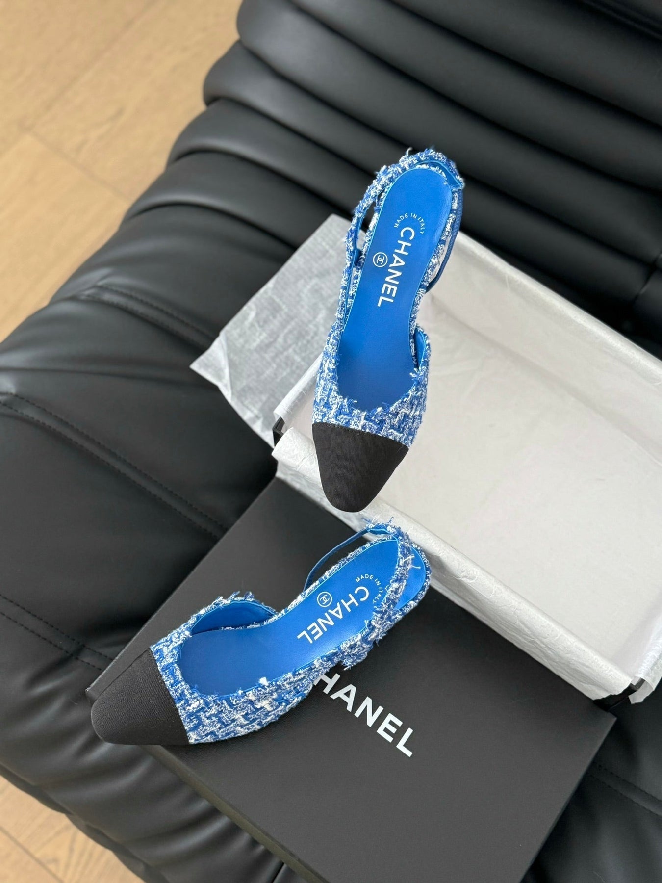 HIGH SLINGBACK IN COBALT BLUE TWEED AND BLACK LAMBSKIN