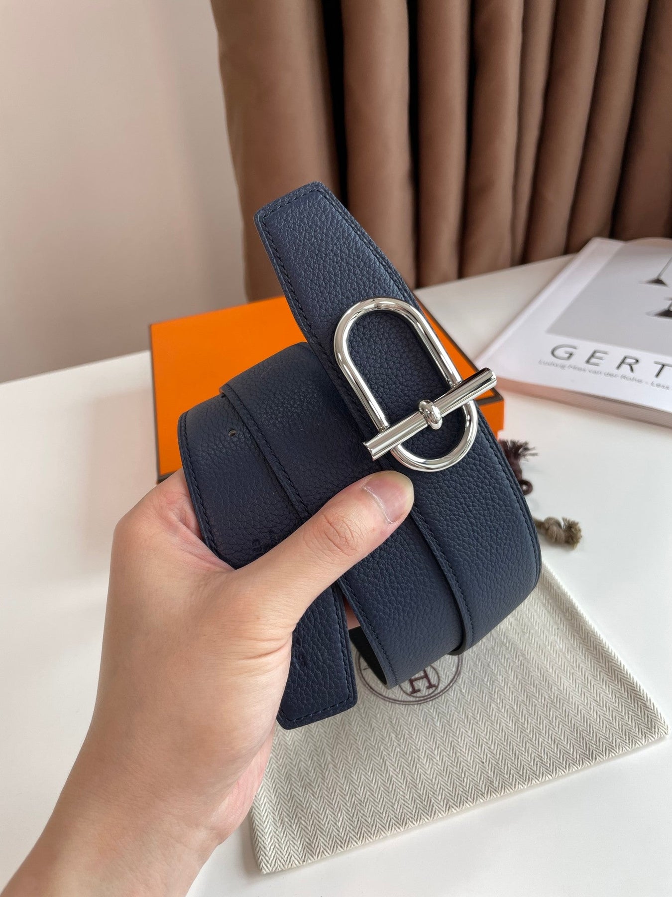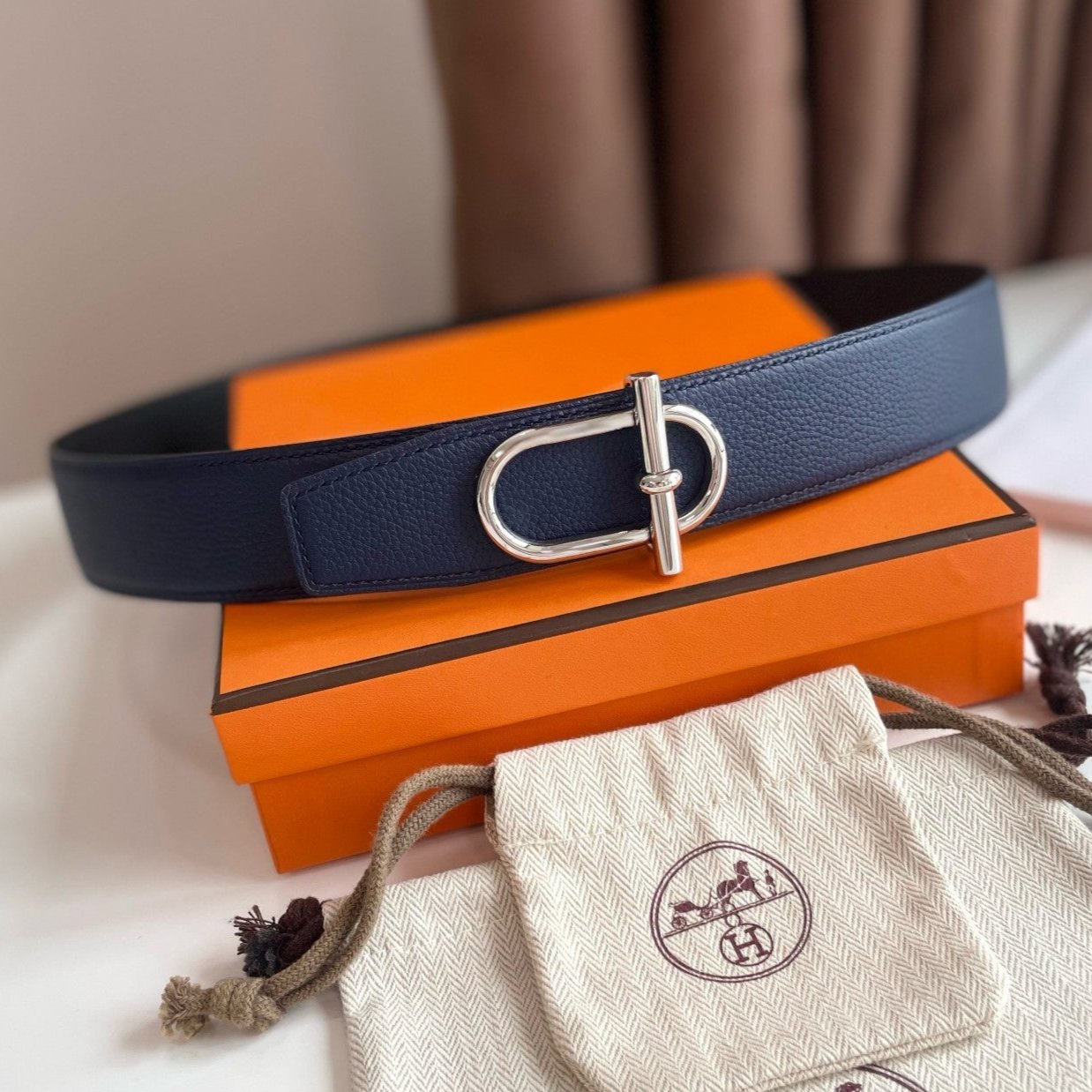 HM ITHAQUE BELT SILVER BUCKLE & REVERSIBLE NAVY BLUE AND BLACK LEATHER STRAP 38MM