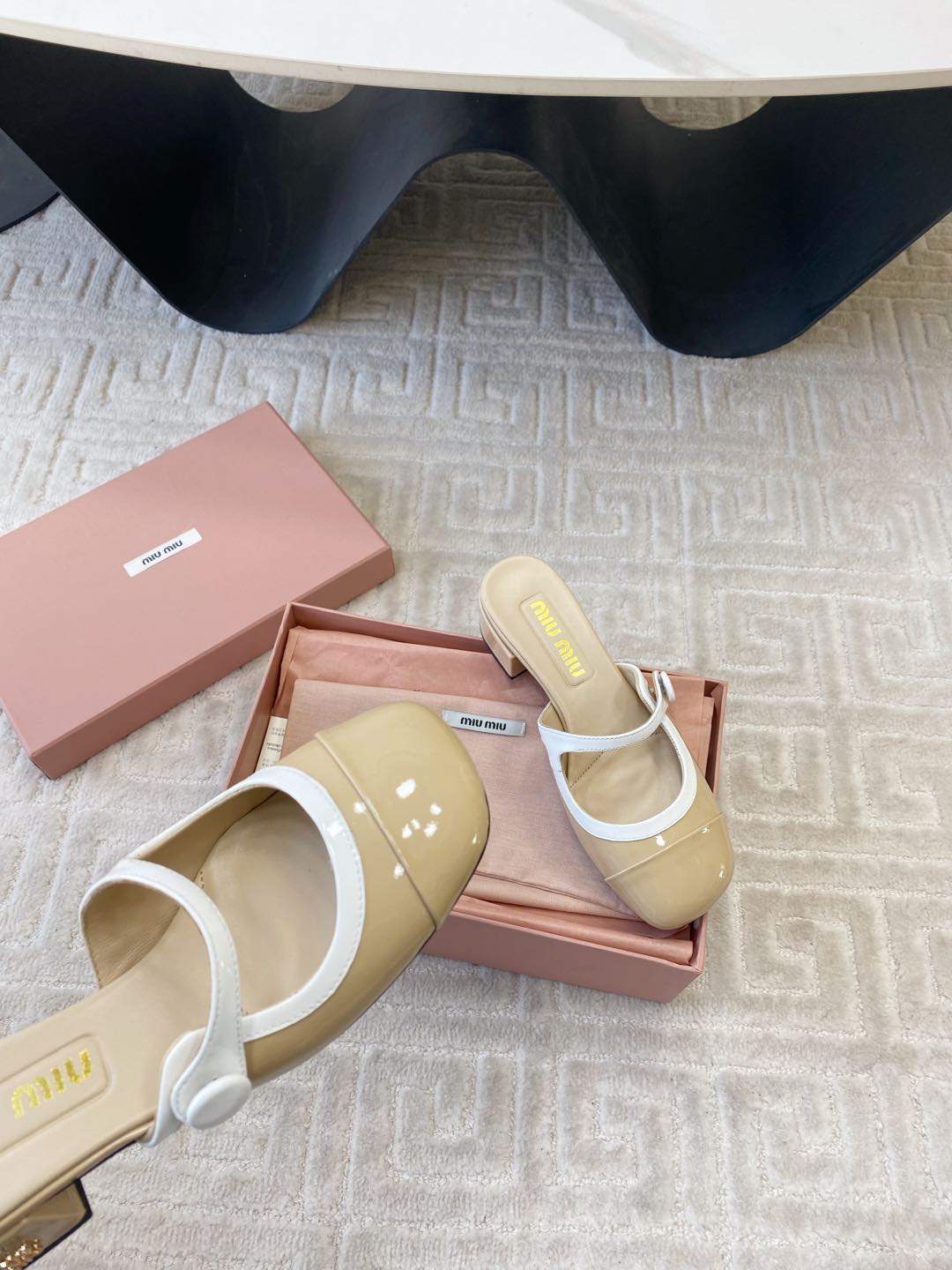 MARY JANE MULE PUMPS IN BEIGE GLOSSY SHEEPSKIN