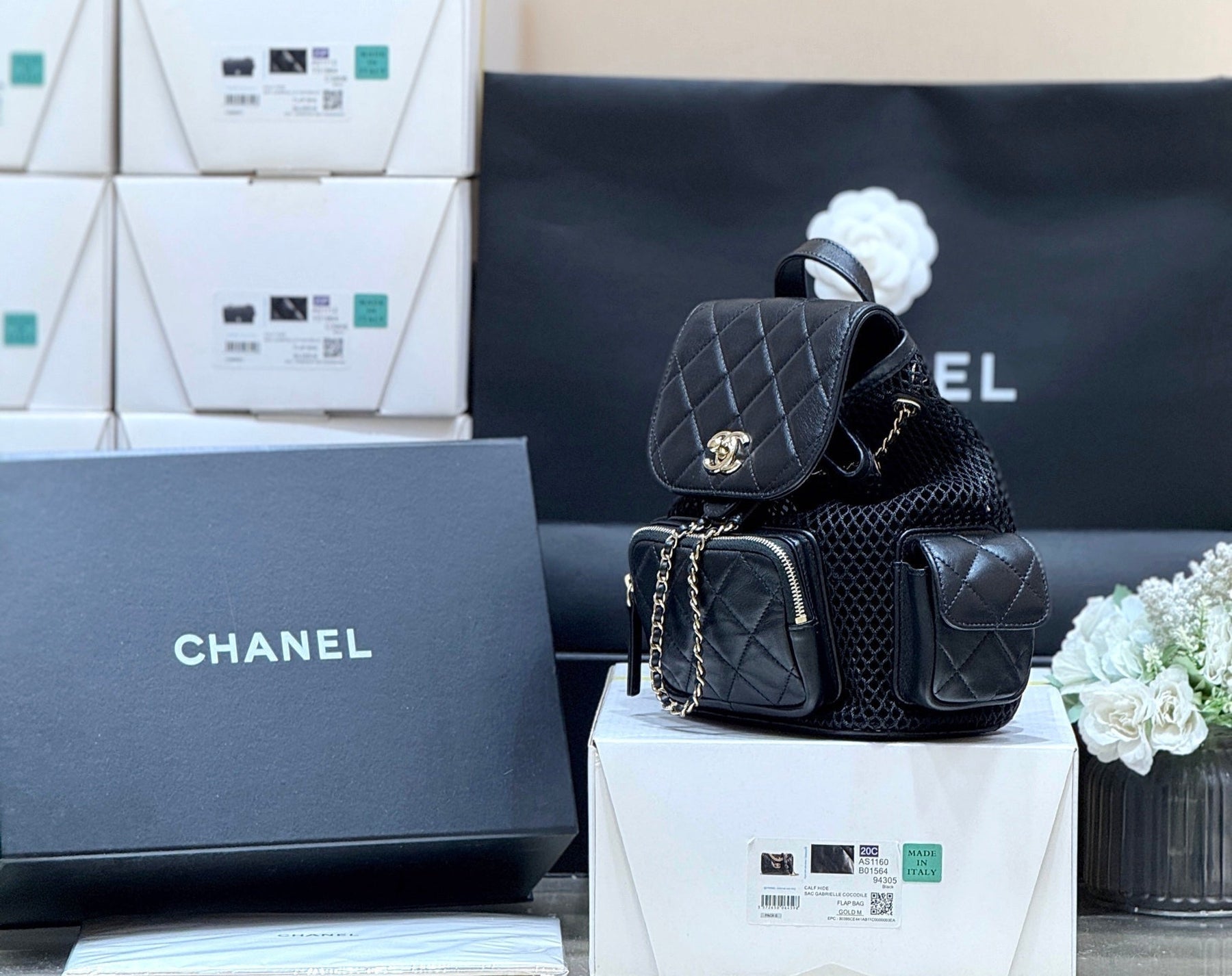 MESH DRAWSTRING BACKPACK 25 IN BLACK CALFSKIN GOLD-TONE METAL