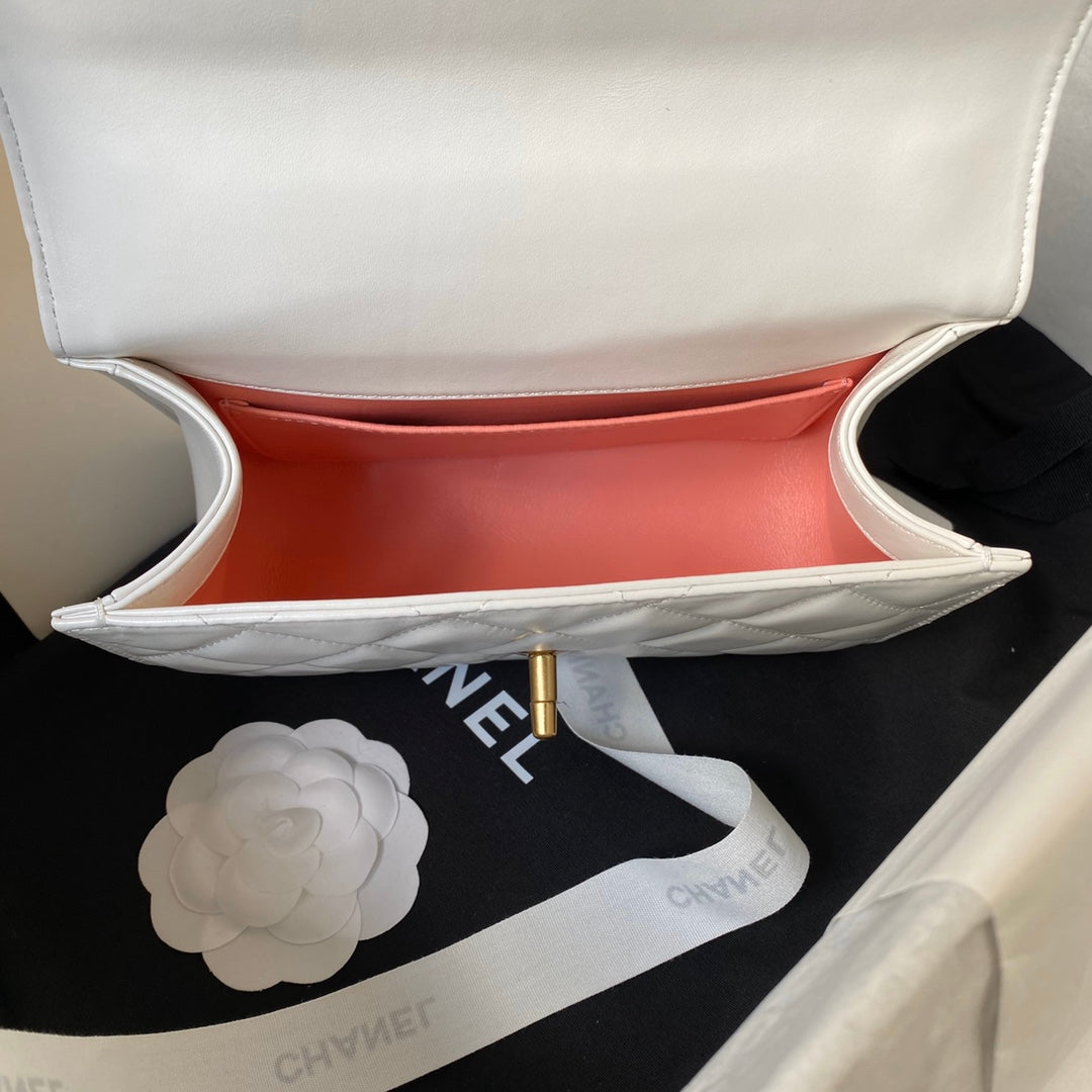 MINI FLAP BAG 19 IN WHITE CALFSKIN WITH DOUBLE GOLD BALL