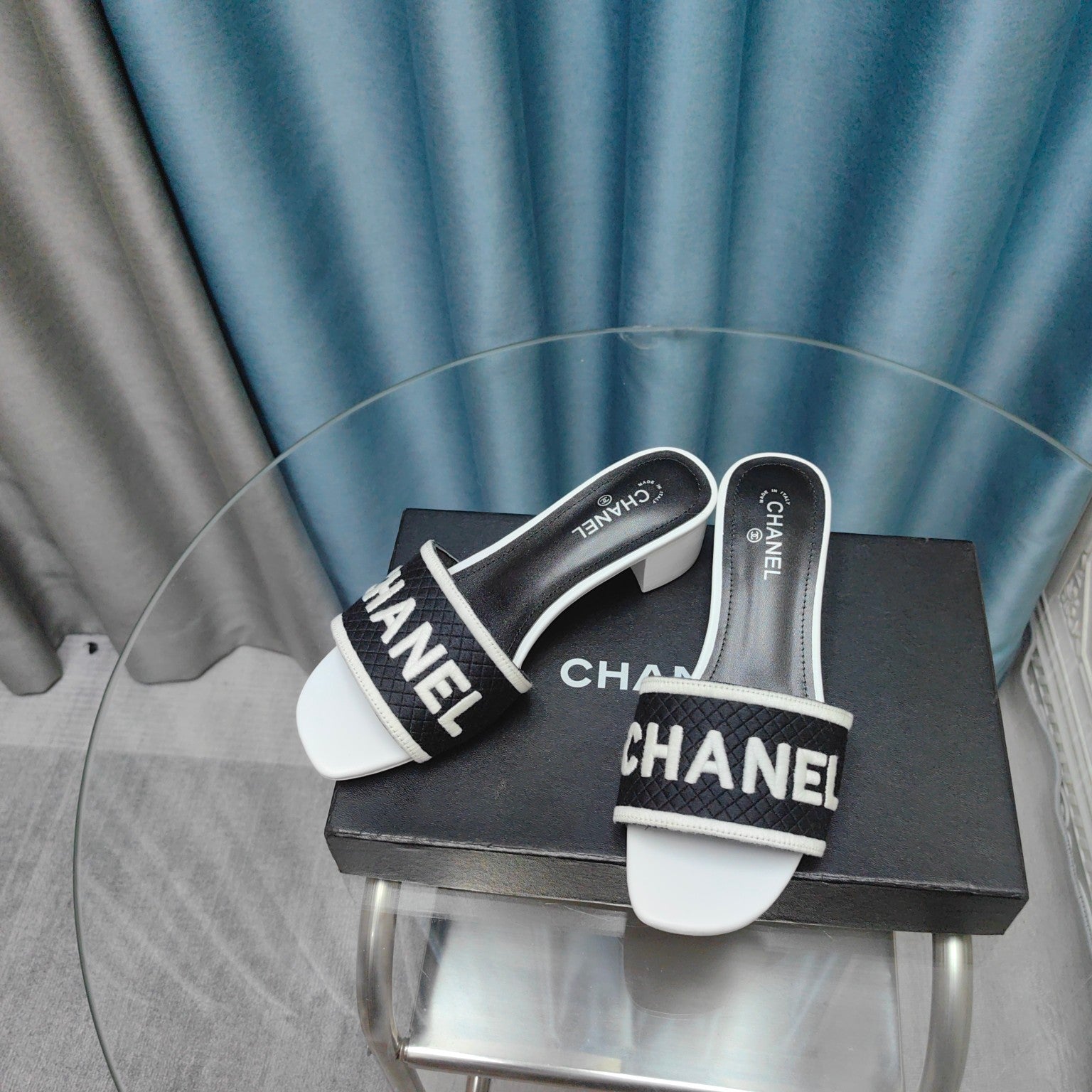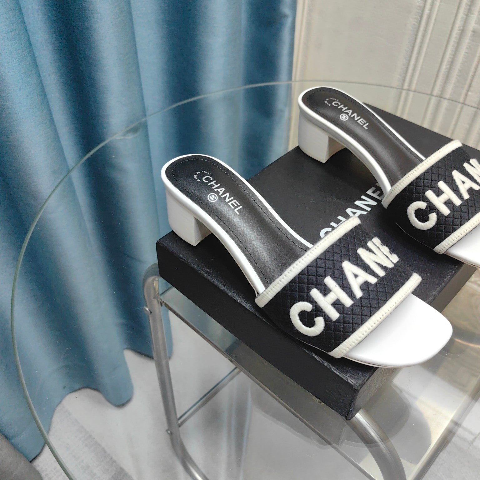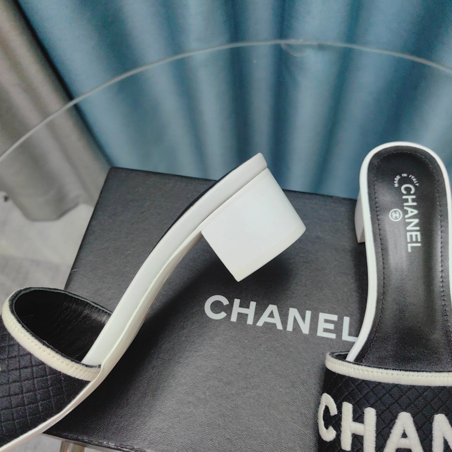 MULE SANDAL 45 WHITE BLACK FABRIC EMBROIDERY