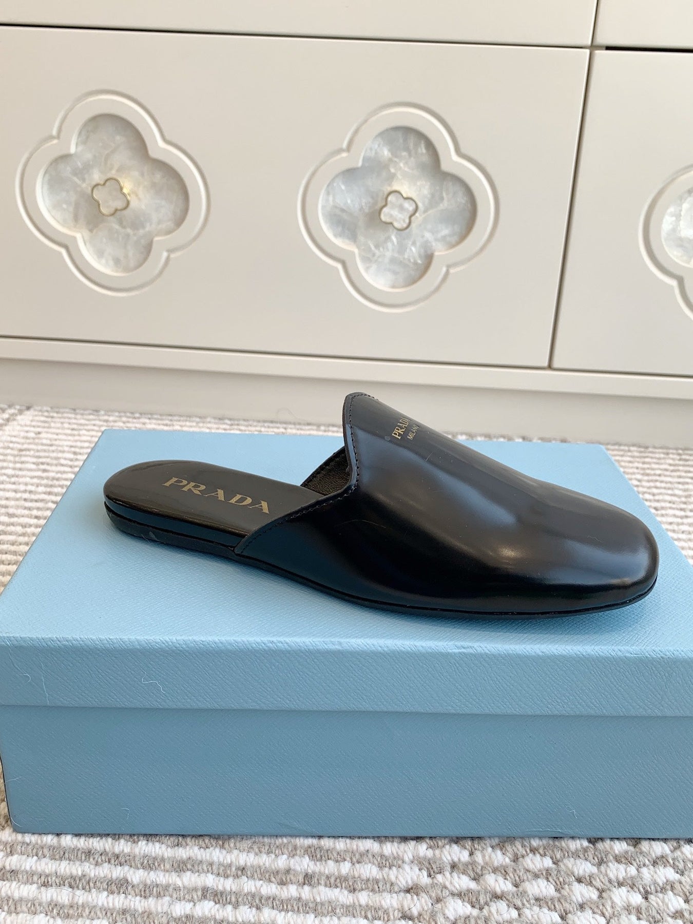 MULES IN BLACK GLOSSY SHEEPSKIN GOLD LETTERING LOGO