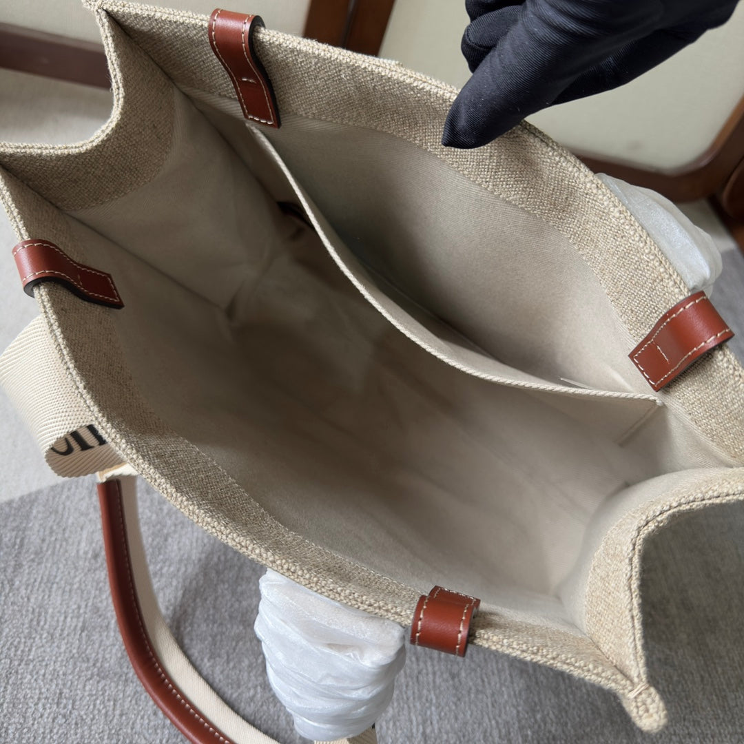 MY MELODY MEDIUM WOODY TOTE BAG 37 IN NATURAL FIBERS BEIGE WEBBING BROWN CALFSKIN