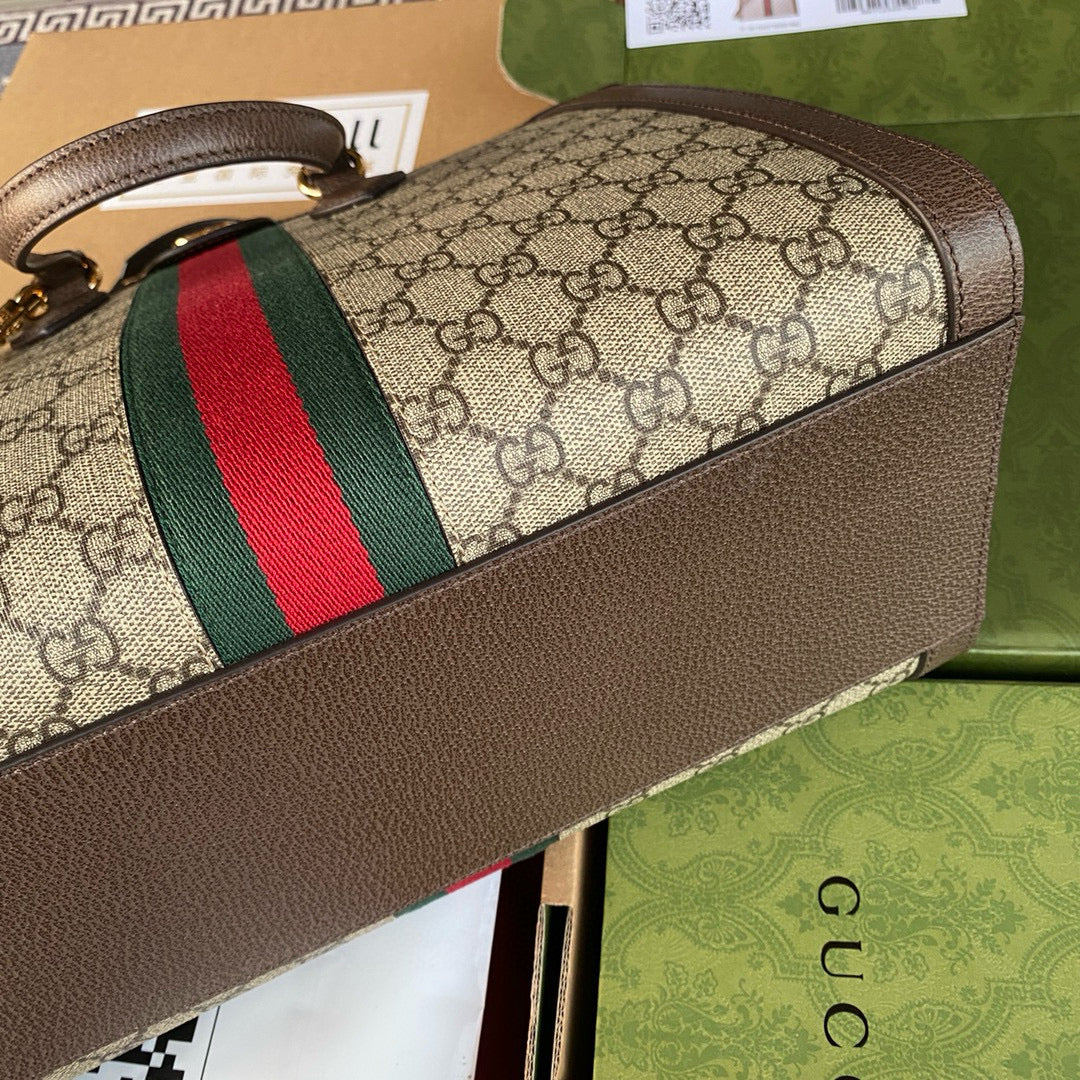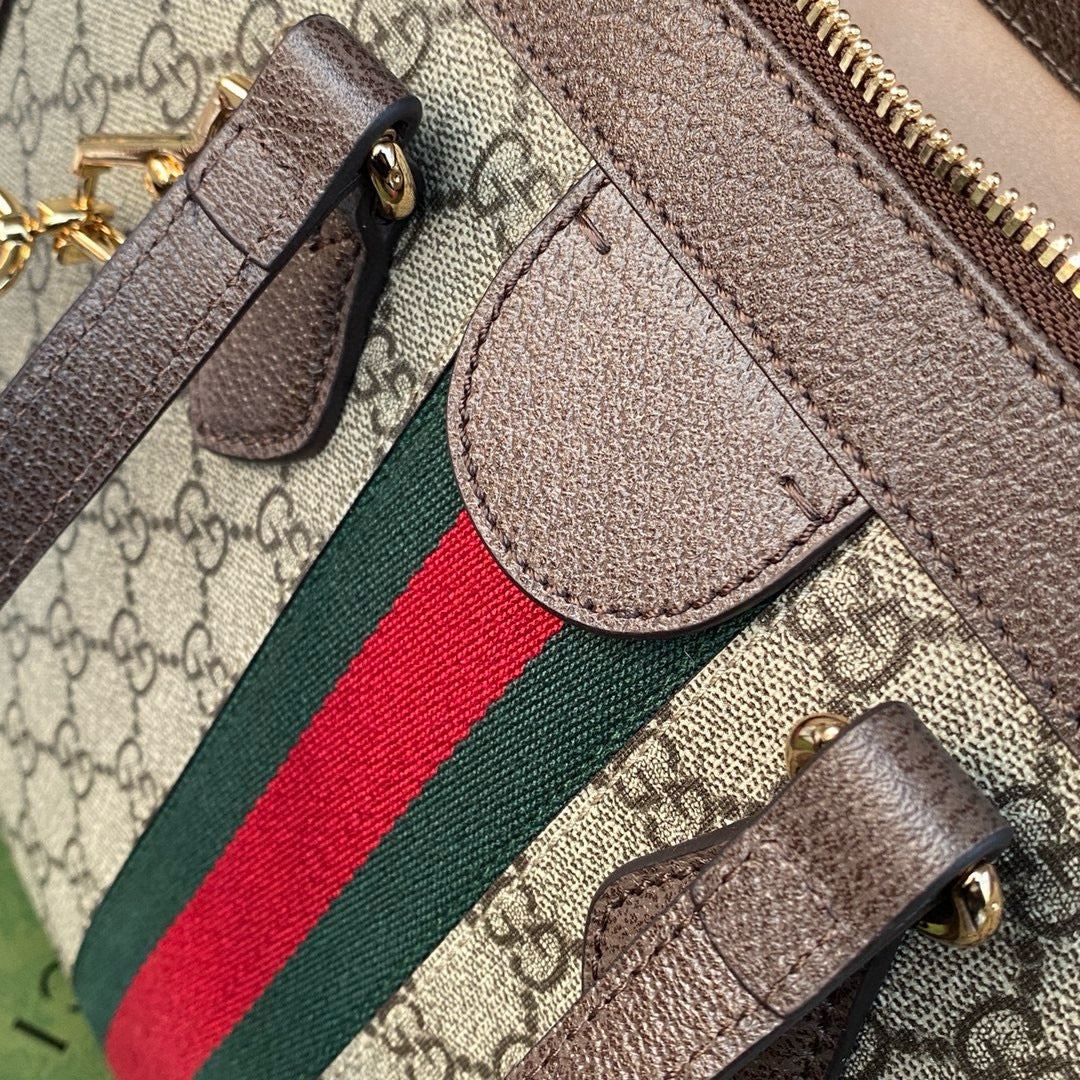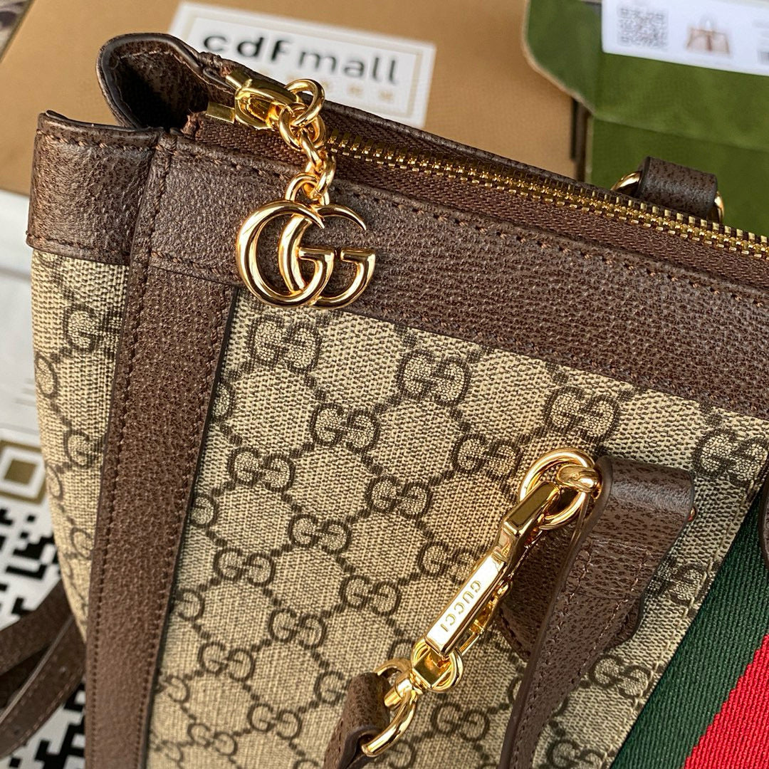 OPHIDIA LARGE 33 CM TOTE BAG IN BEIGE/EBONY GG CANVAS WITH BROWN LEATHER TRIM