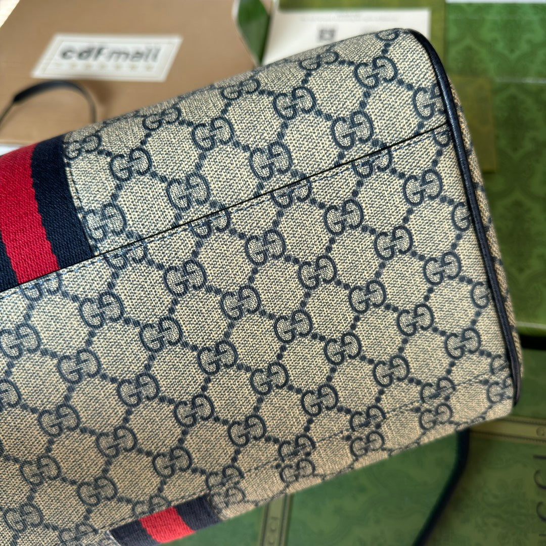OPHIDIA LARGE BOSTON BAG 31 IN BEIGE AND BLUE GG CALFSKIN