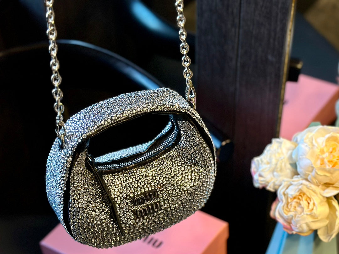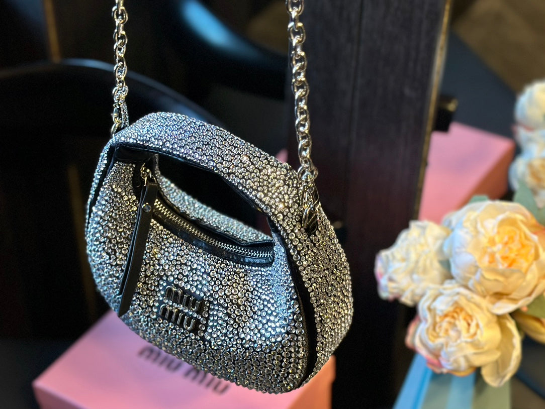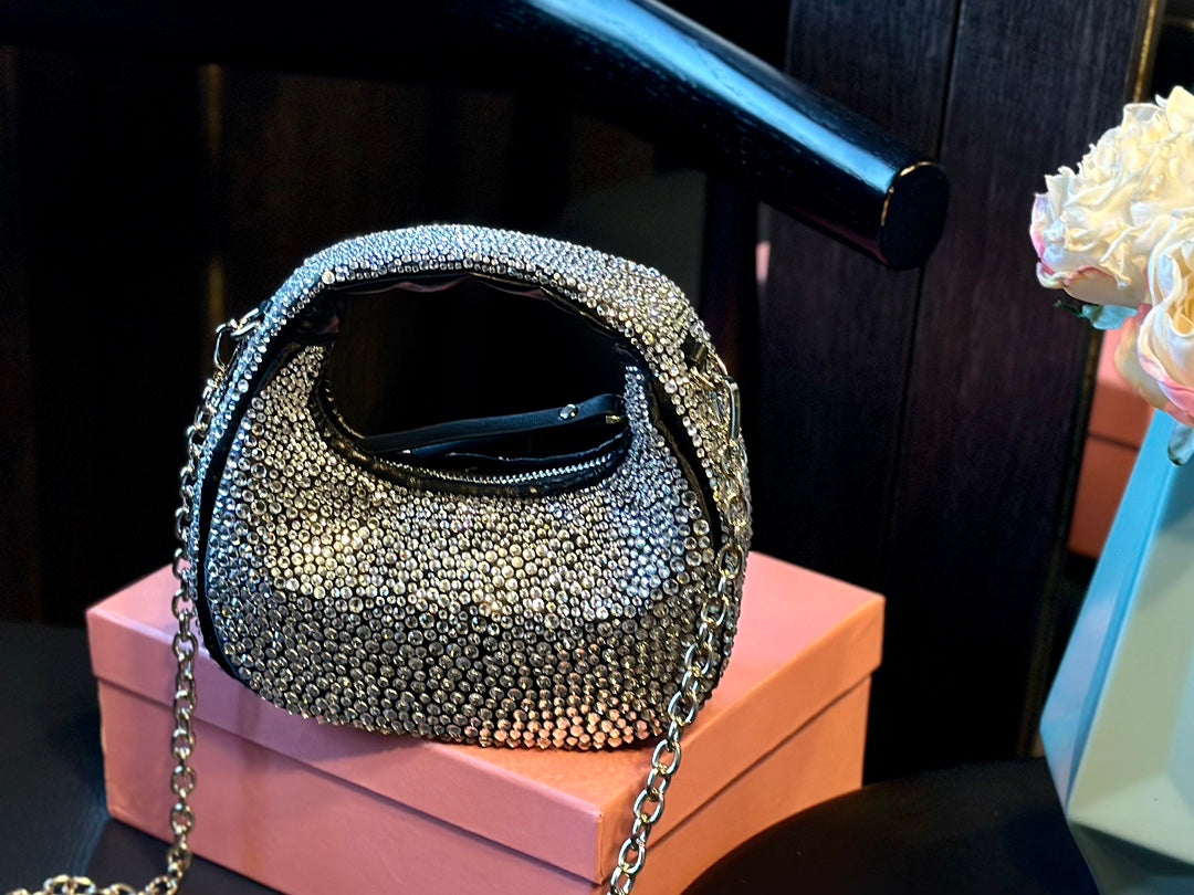 PARTY RHINESTONE BAG 17 IN BLACK FABRIC AND LEATHER TRIM