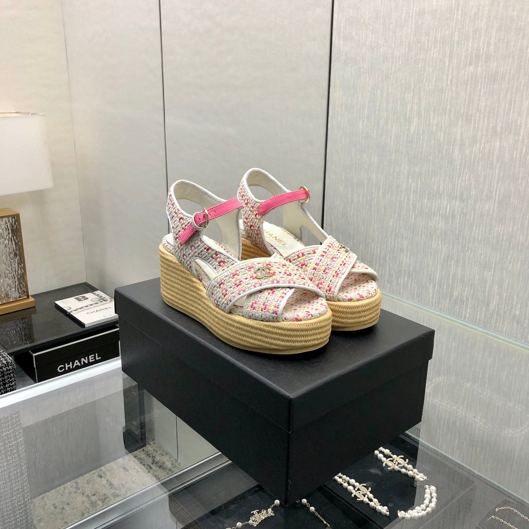 PEEP-TOE THICK SOLE SANDALS IN WHITE MIX BRIGHT PINK WOVEN FABRIC