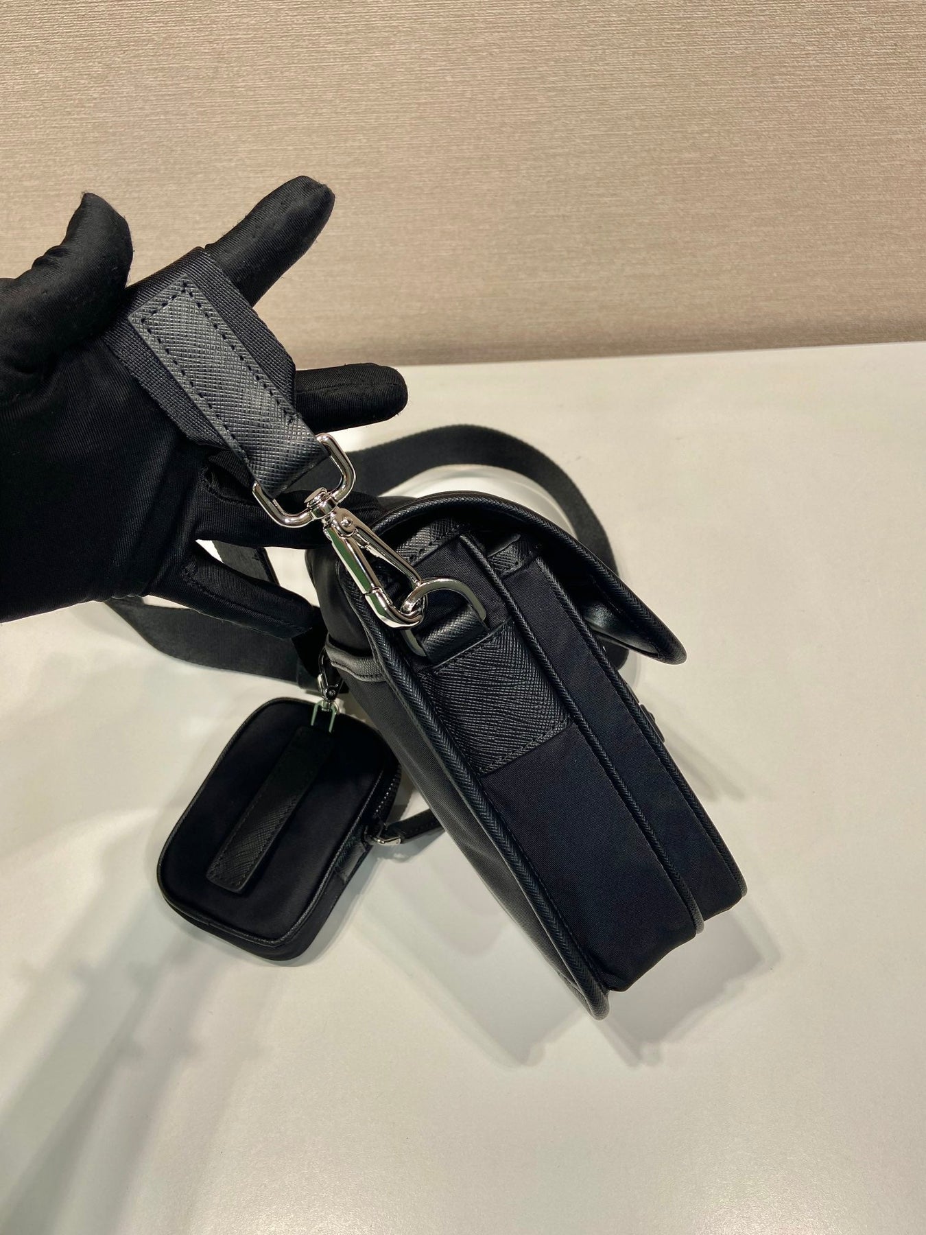 PHONE BAG 19 IN BLACK RE-NYLON AND SAFFIANO LEATHER TRIM