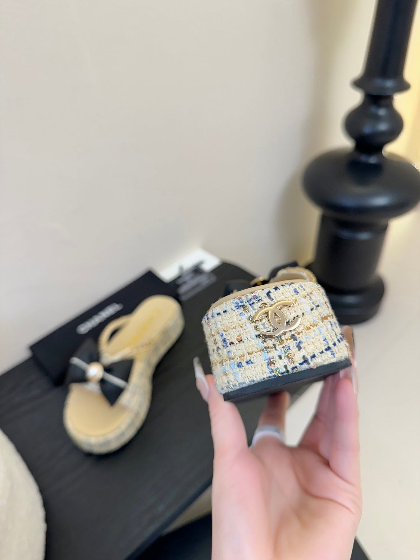 PLATFORM FLIP-FLOPS IN BEIGE TWEED FABRIC