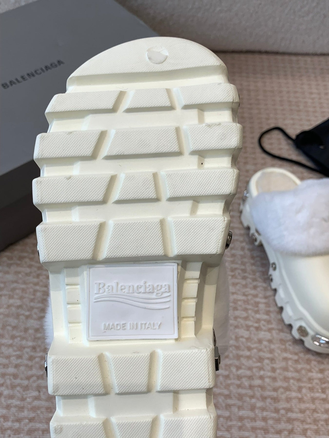 PLATFORM MULES IN BEIGE RUBBER MIX RABBIT FUR SILVER HARDWARE